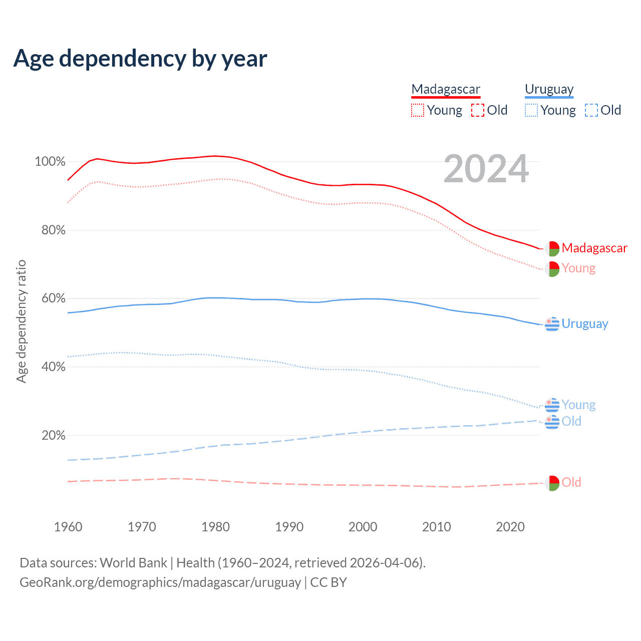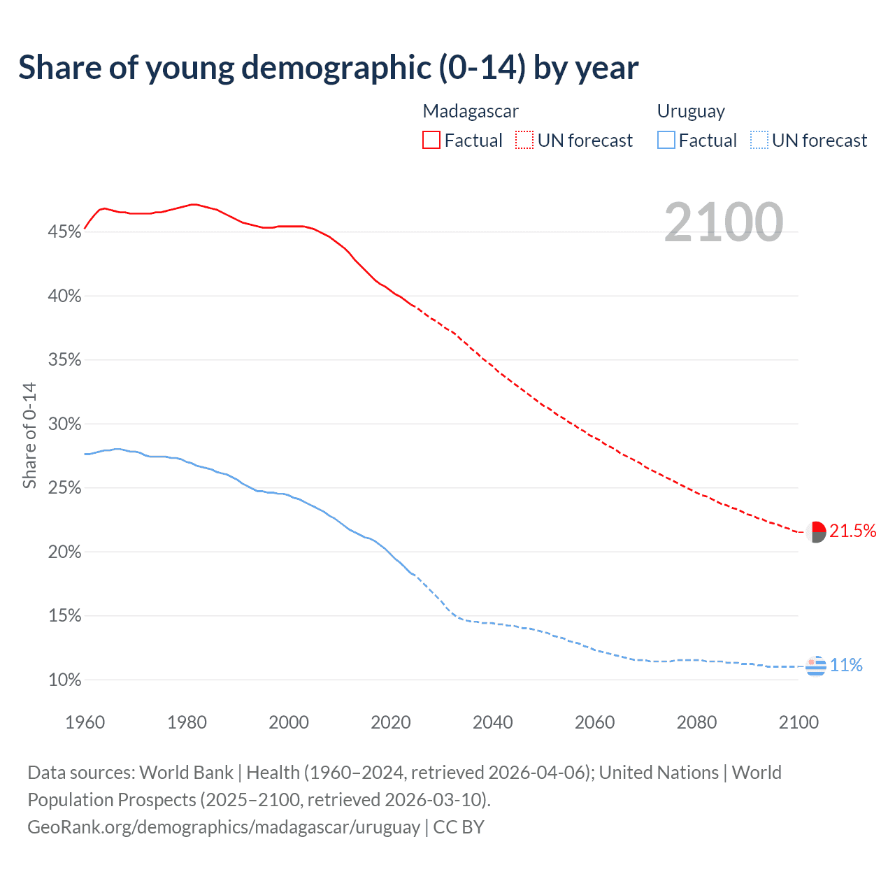 - The share of young demographic (0-15 years old) in Madagascar is 39.3% vs 18.3% in Uruguay.