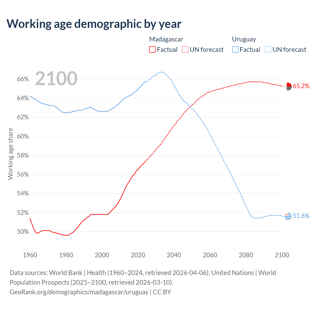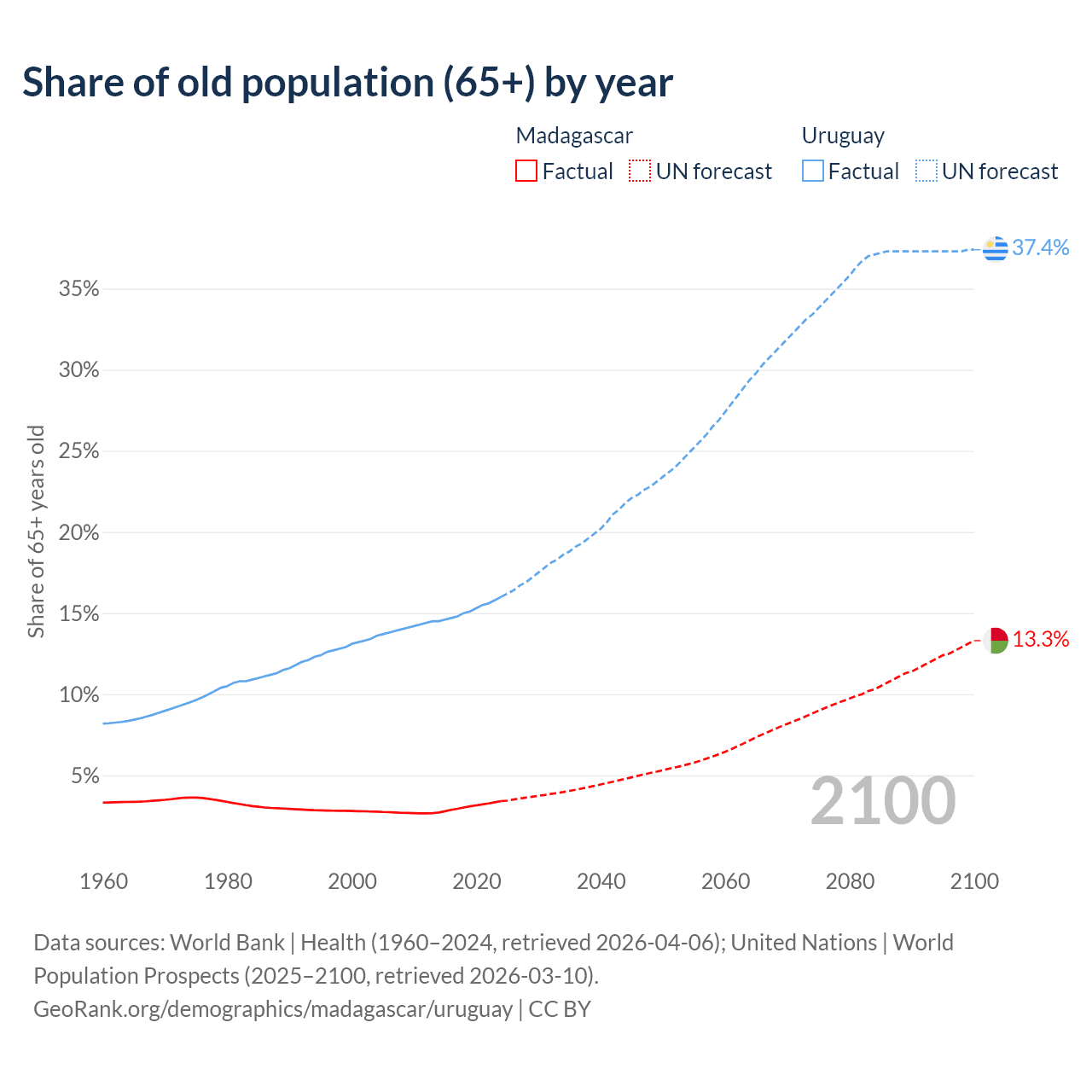 The share of older people aged 65 and over is 3.41% in Madagascar and 16% in Uruguay. Life expectancy in Madagascar compared to Uruguay .