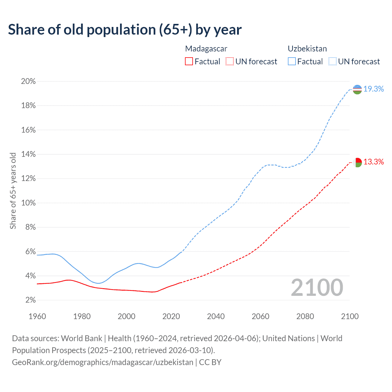 The share of older people aged 65 and over is 3.41% in Madagascar and 5.86% in Uzbekistan. Life expectancy in Madagascar compared to Uzbekistan .