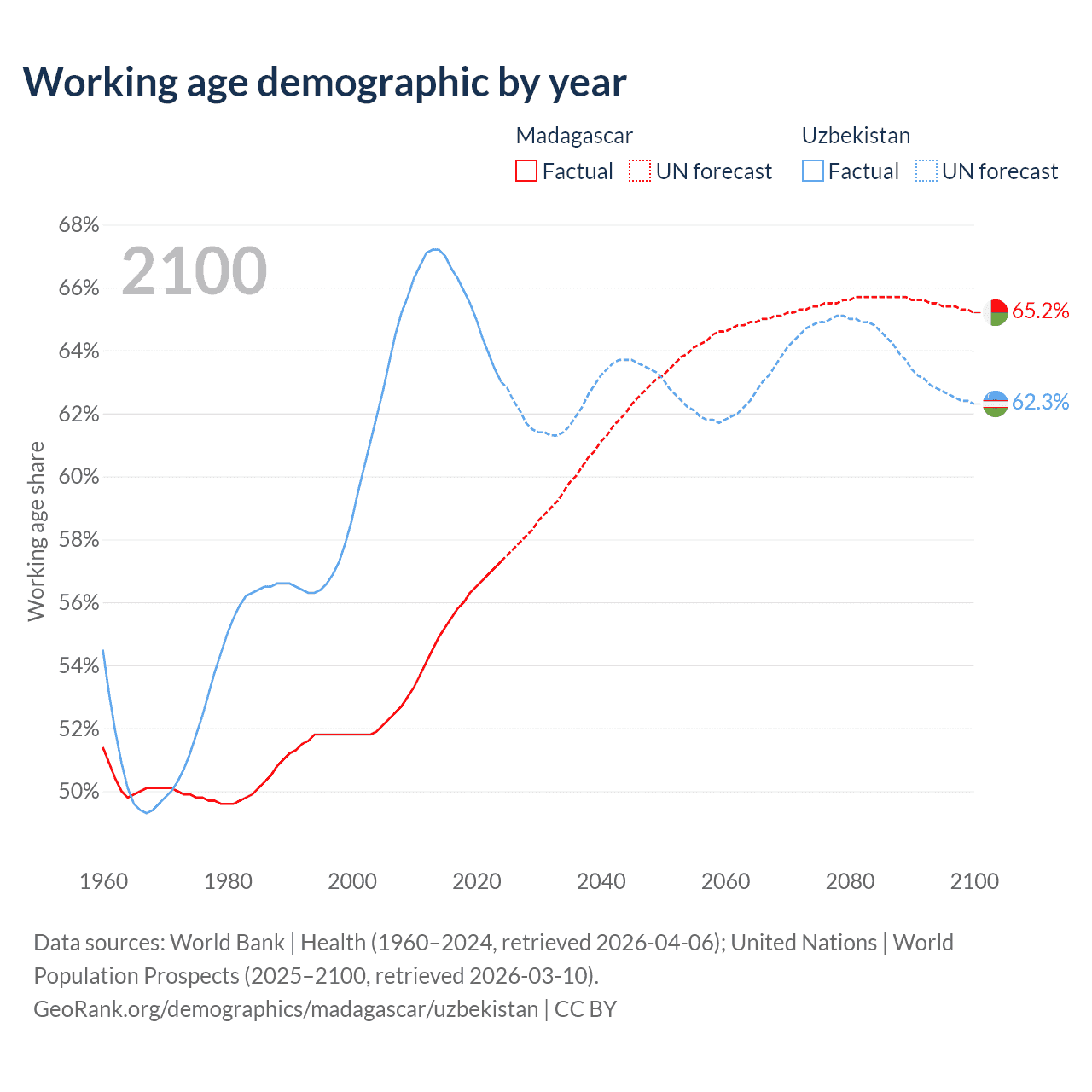 Median age Madagascar vs Uzbekistan, 1960-2100