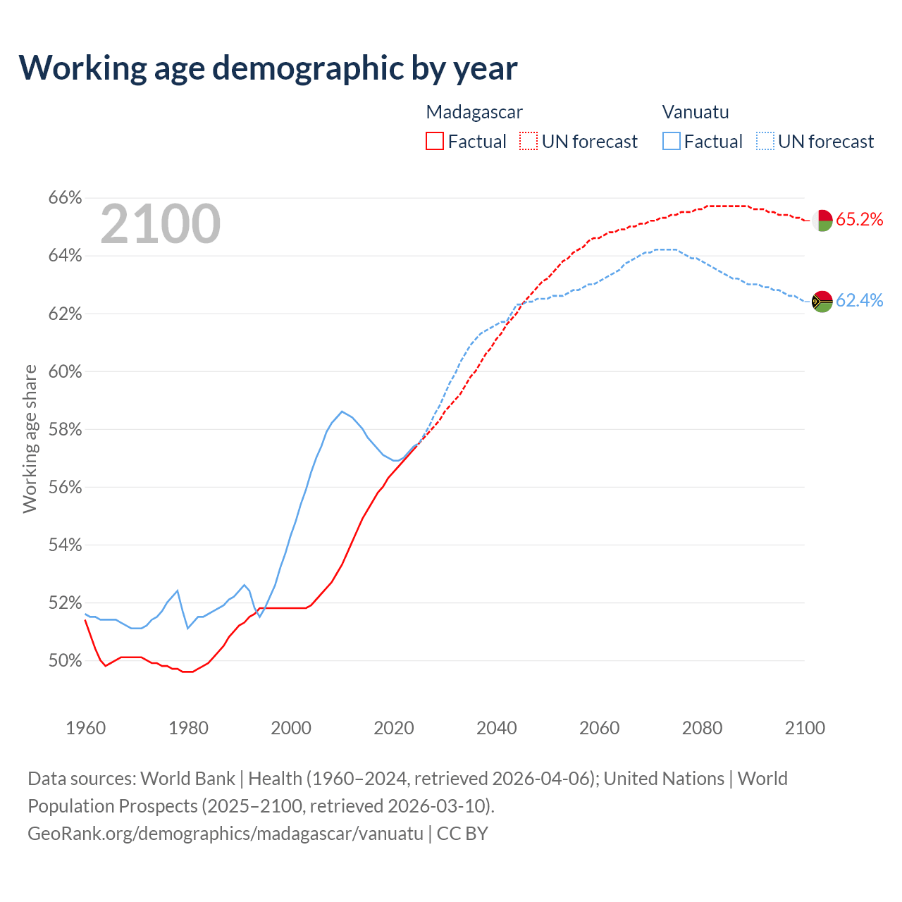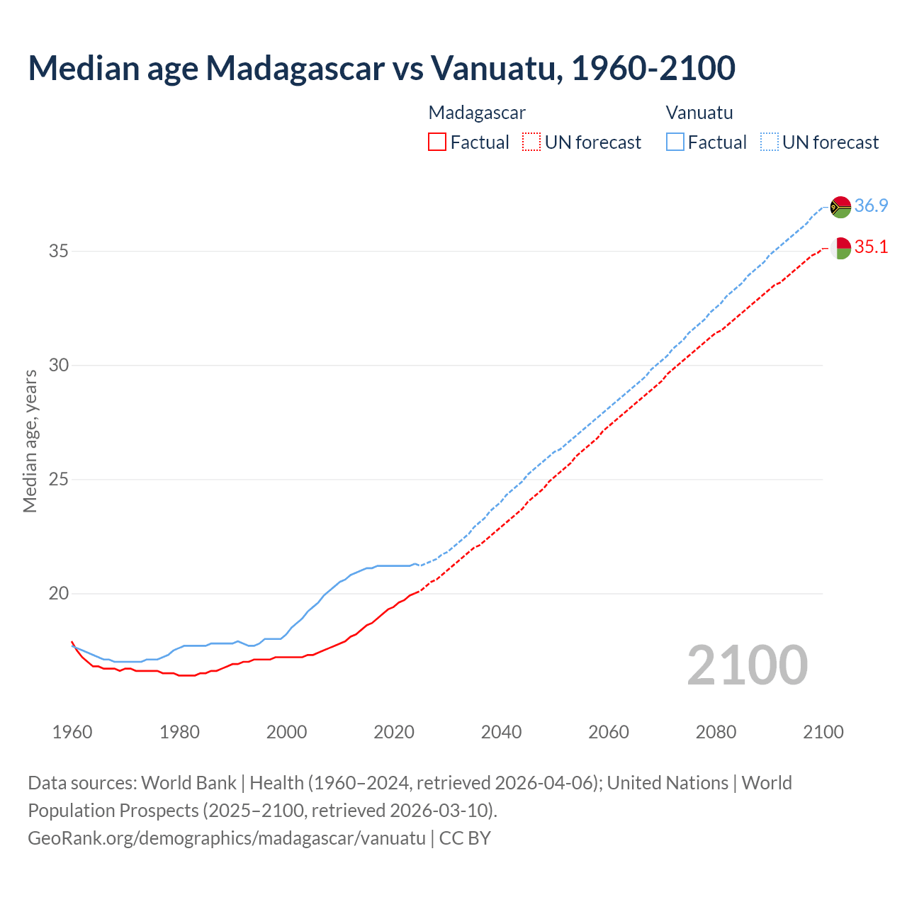 Median age Madagascar vs Vanuatu, 1960-2100