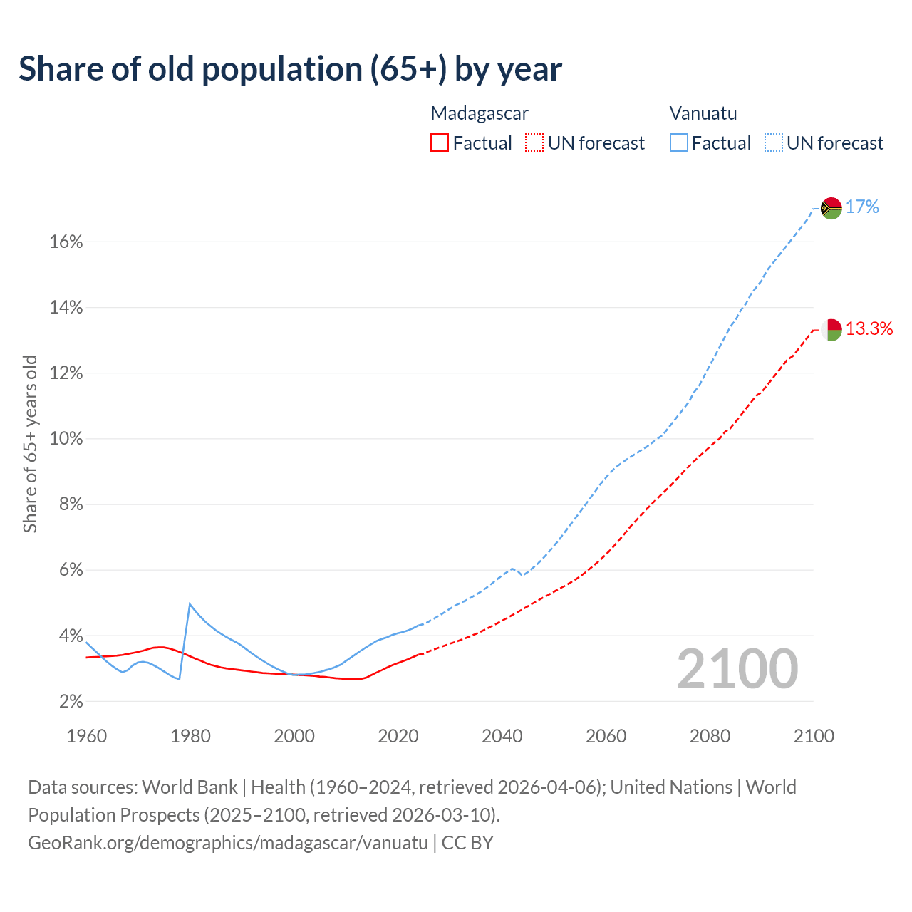 The share of older people aged 65 and over is 3.41% in Madagascar and 4.3% in Vanuatu. Life expectancy in Madagascar compared to Vanuatu .