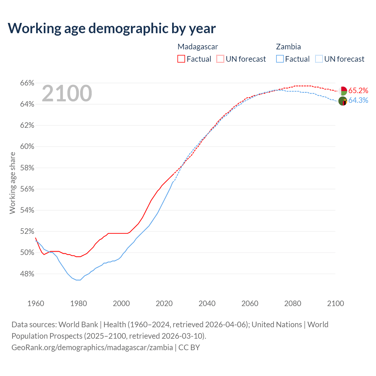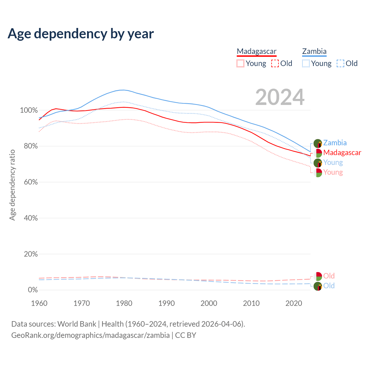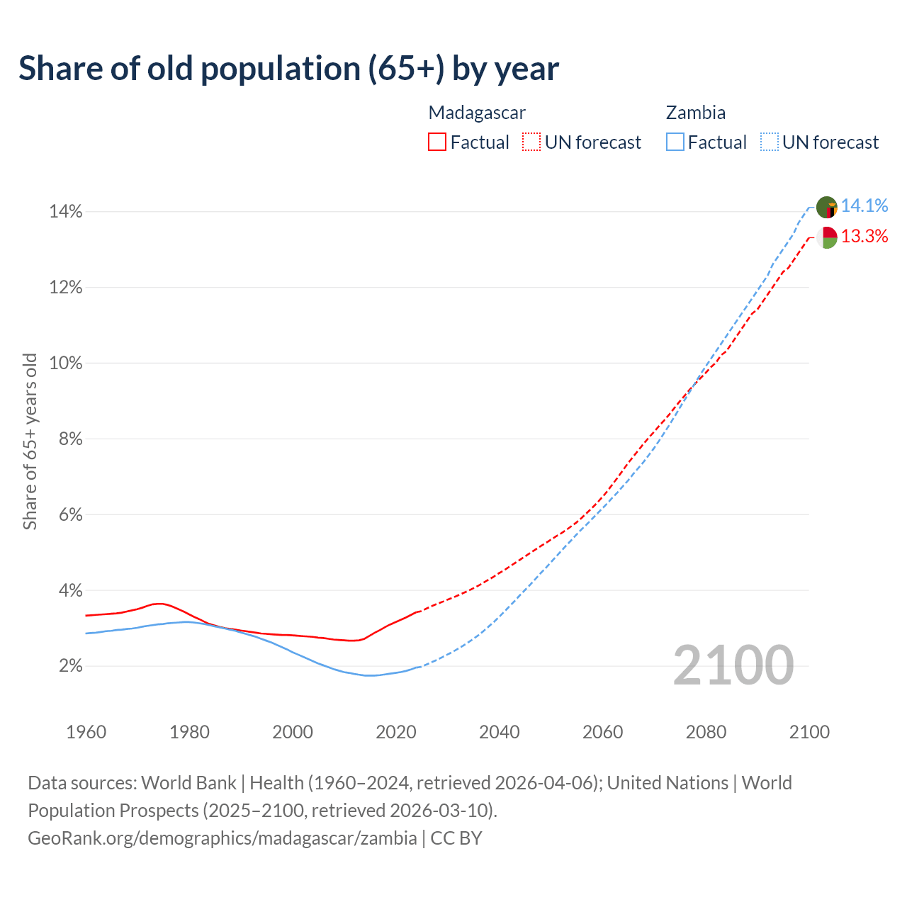 The share of older people aged 65 and over is 3.41% in Madagascar and 1.95% in Zambia. Life expectancy in Madagascar compared to Zambia .