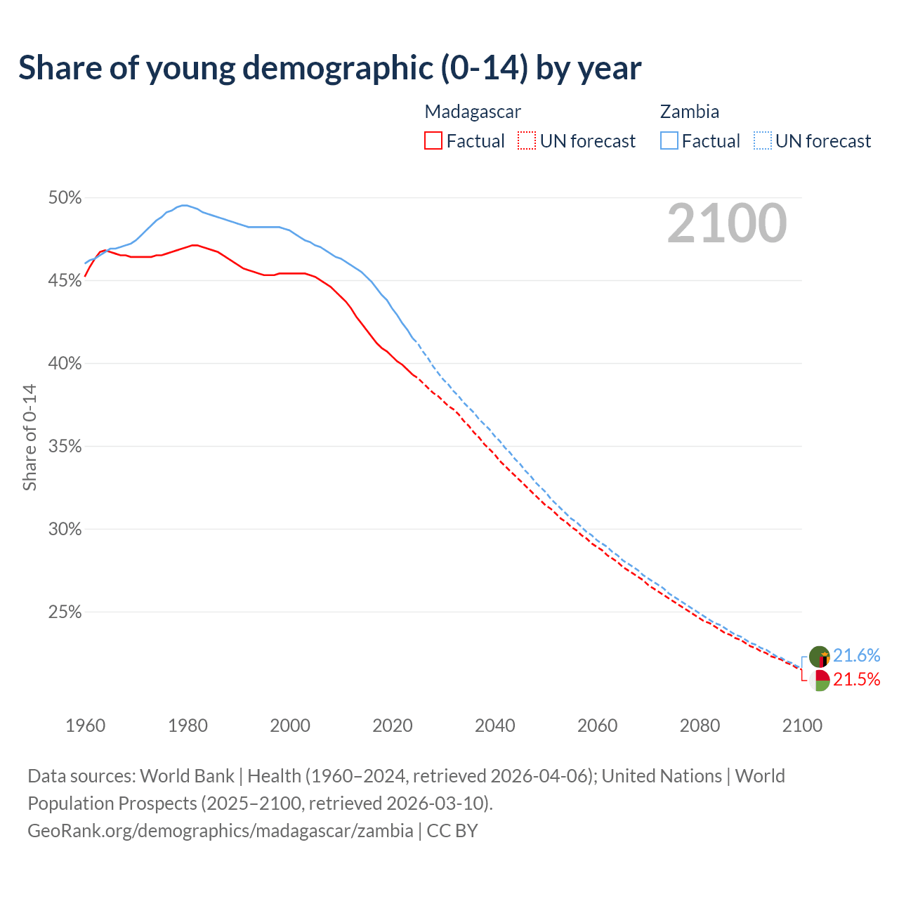 - The share of young demographic (0-15 years old) in Madagascar is 39.3% vs 41.5% in Zambia.