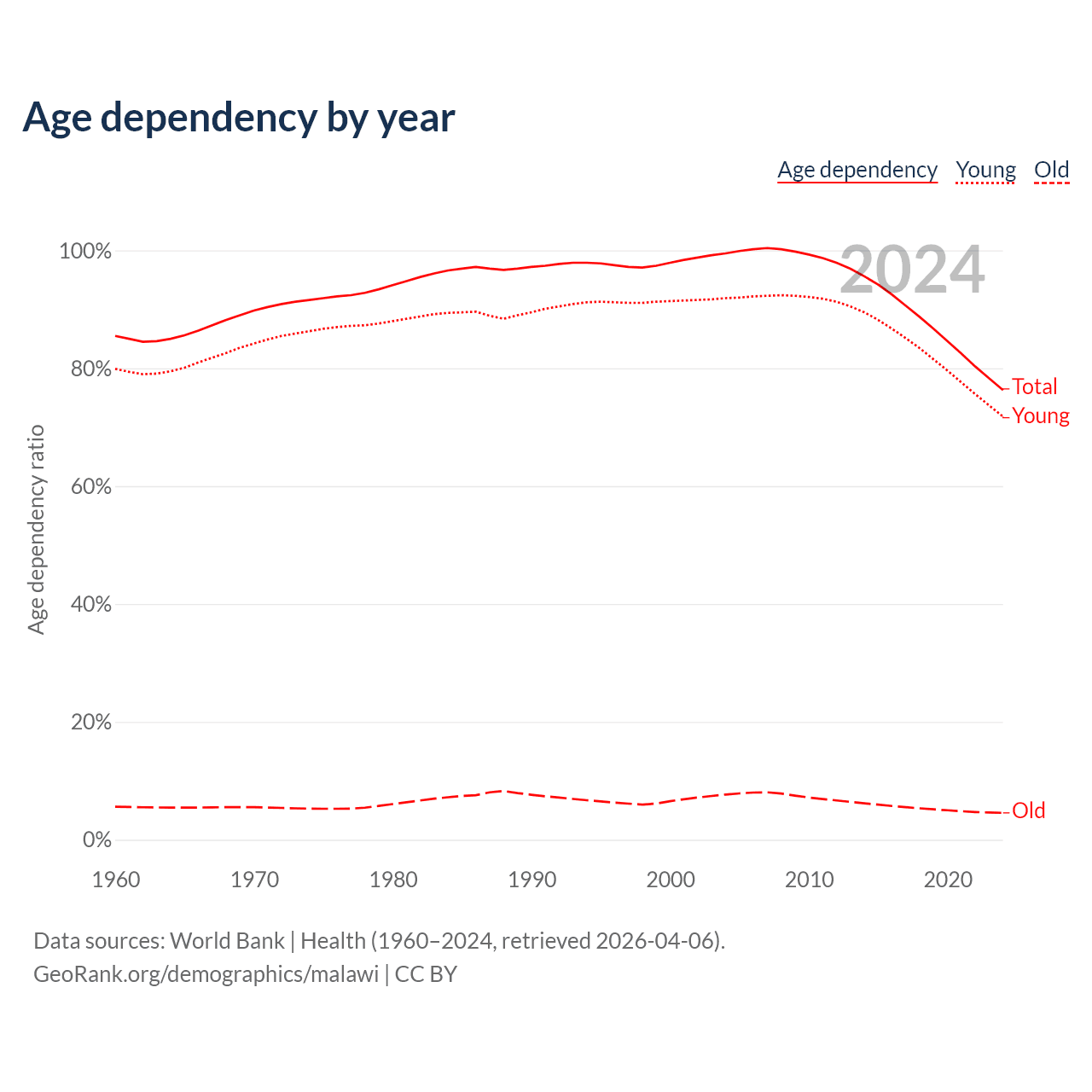 Data sources: World Bank | Health (1960–2024, retrieved 2026-04-06); U.S. Census Bureau (1960–2024, retrieved 2026-02-08).