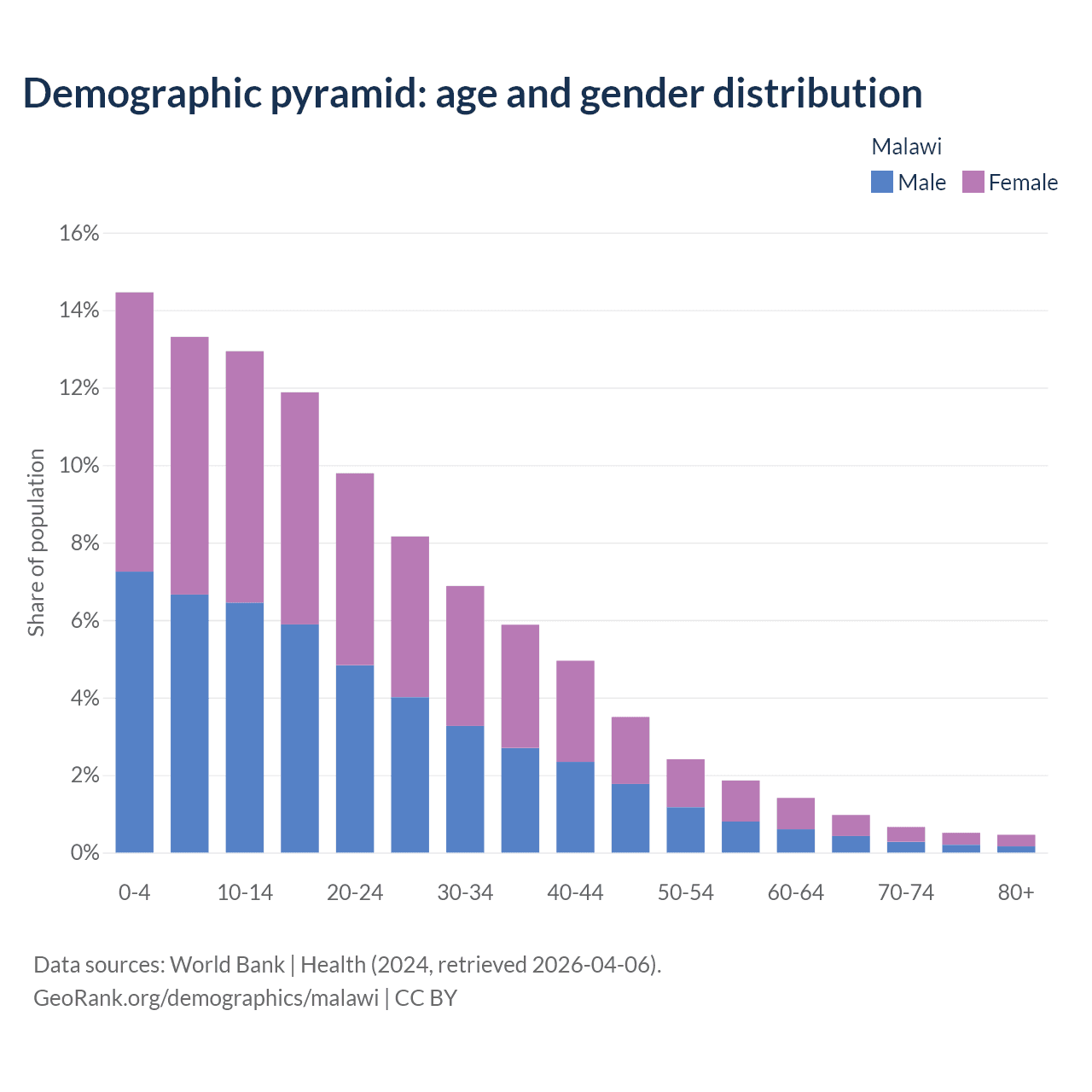 With a population of 21.7M people, Malawi has a median age of 18.9 years which makes it the 181/196 oldest country. 40.7% of the demographic are children 0-14 years old, 56.7% are working-age people aged 15-64, and 2.59% are older population aged 65+ years.