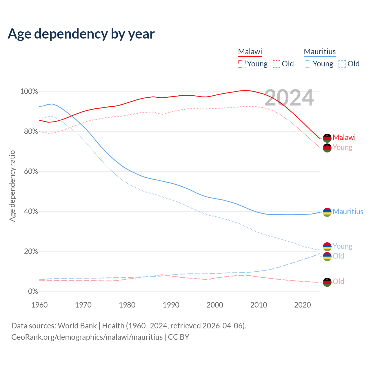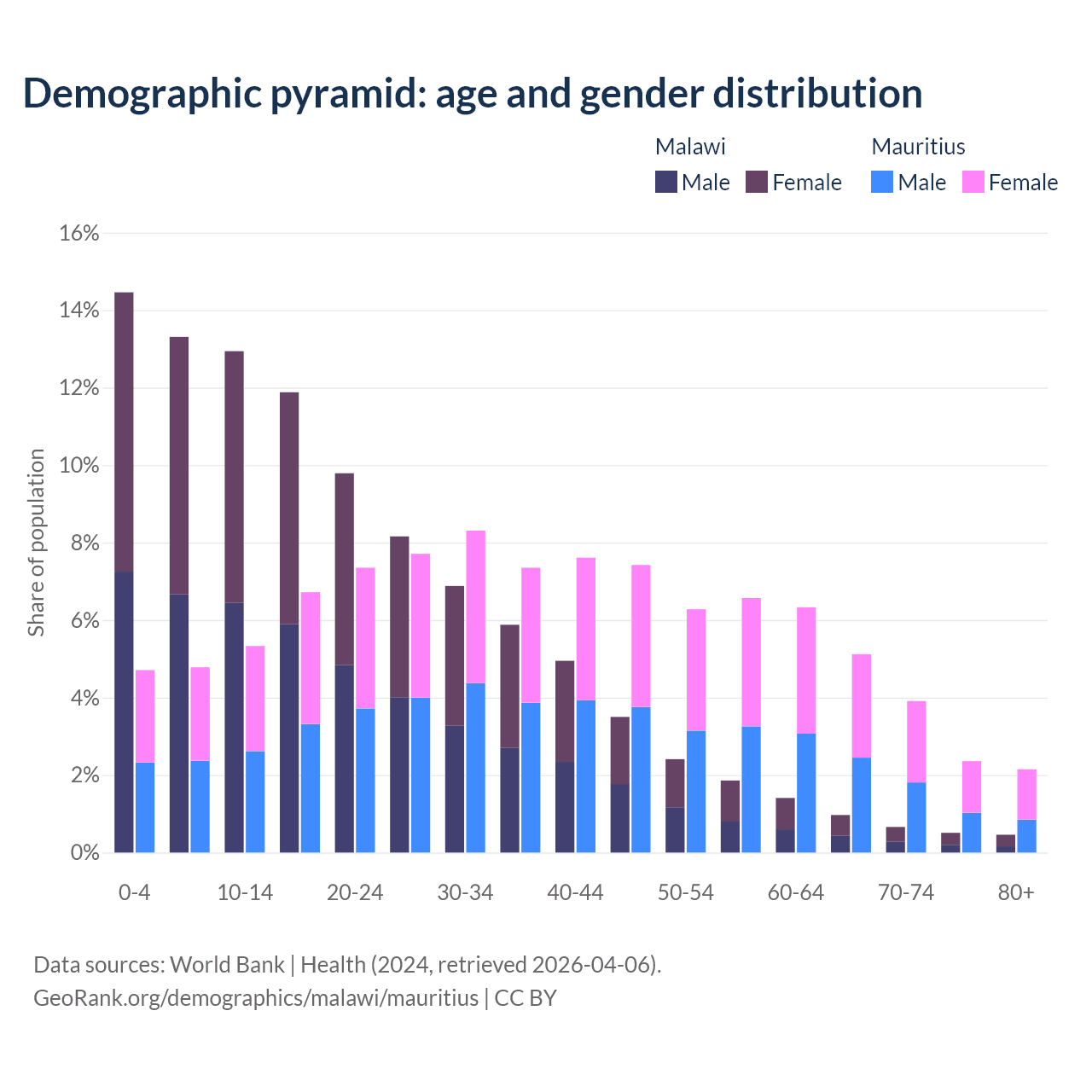 - Malawi is ranked 181/196 by median age (oldest to youngest) vs 57/196 for Mauritius.