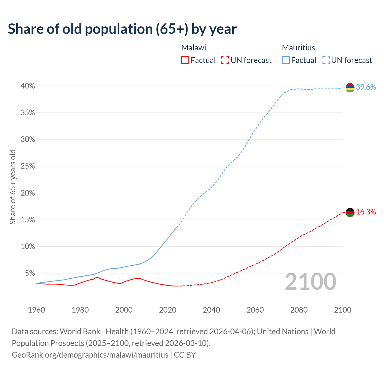 The share of older people aged 65 and over is 2.59% in Malawi and 13.5% in Mauritius. Life expectancy in Malawi compared to Mauritius .