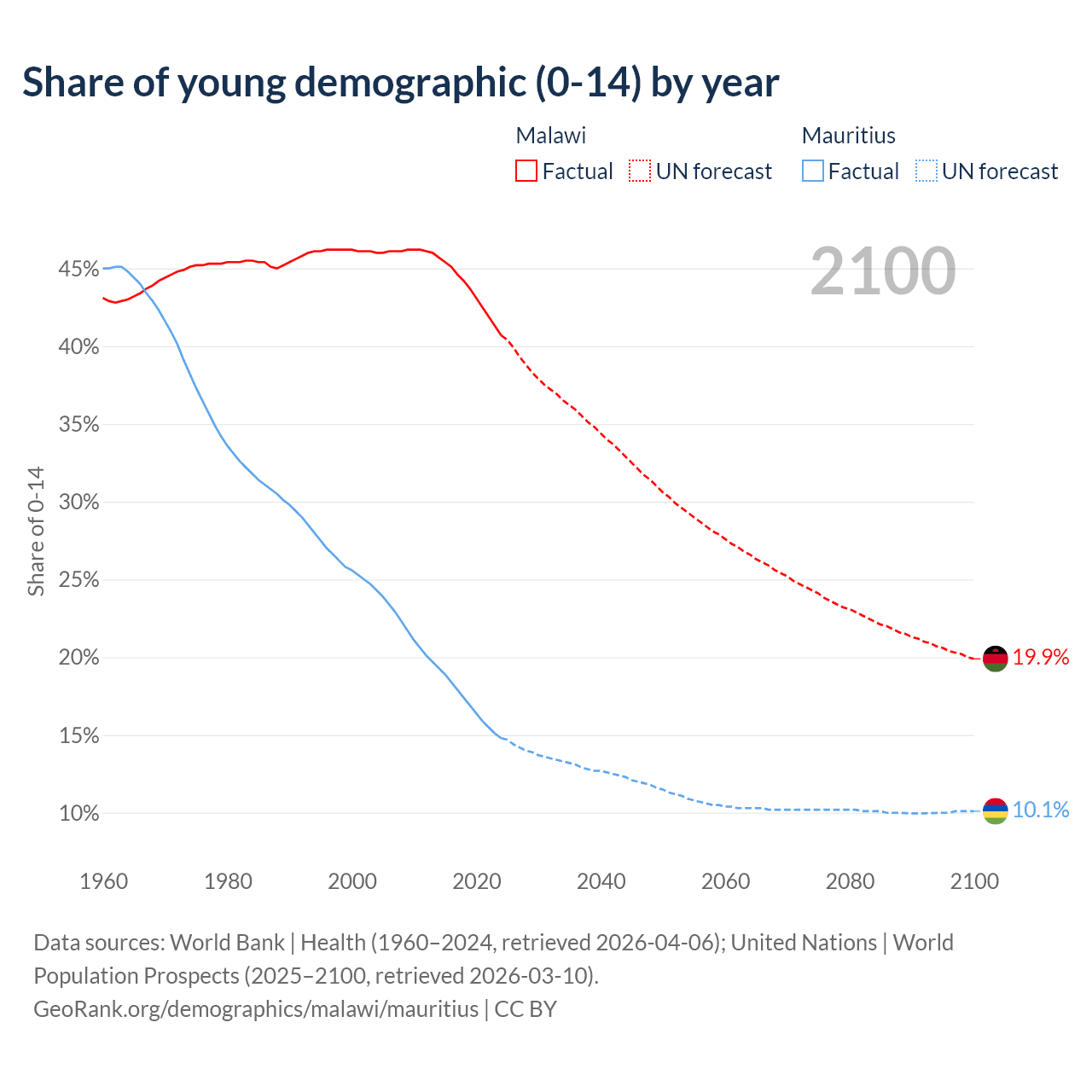 - The share of young demographic (0-15 years old) in Malawi is 40.7% vs 14.8% in Mauritius.