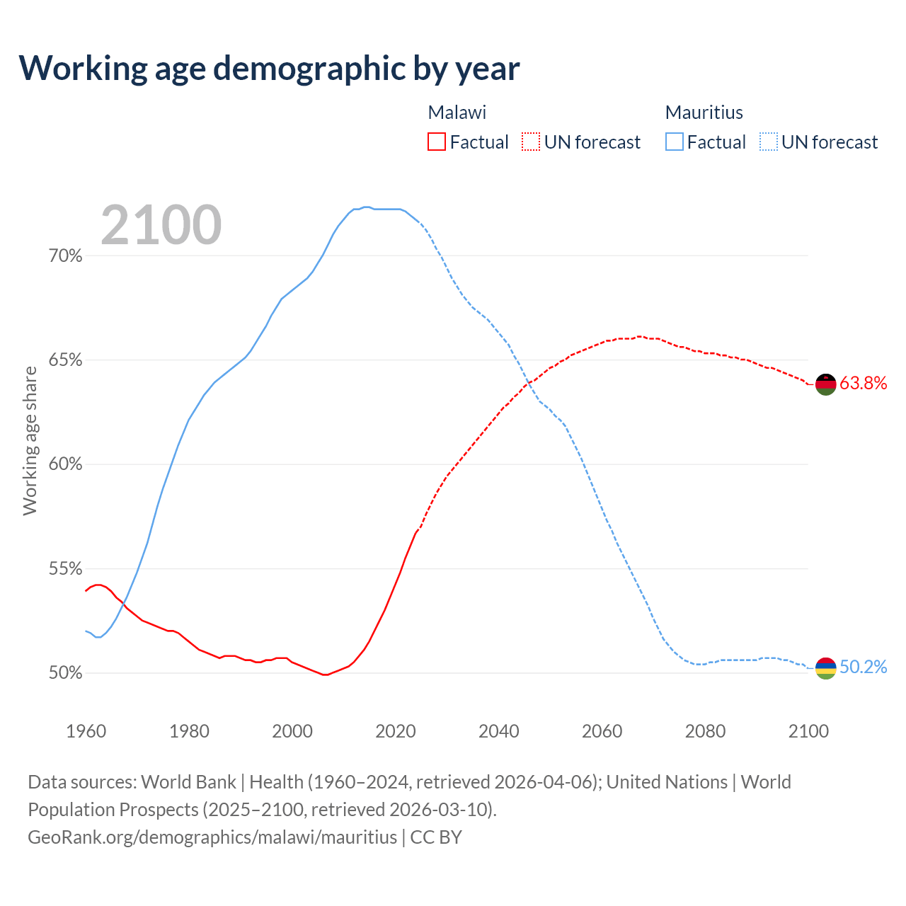 - Malawi has 13M working age adults (aged 15-64) vs 889K in Mauritius.