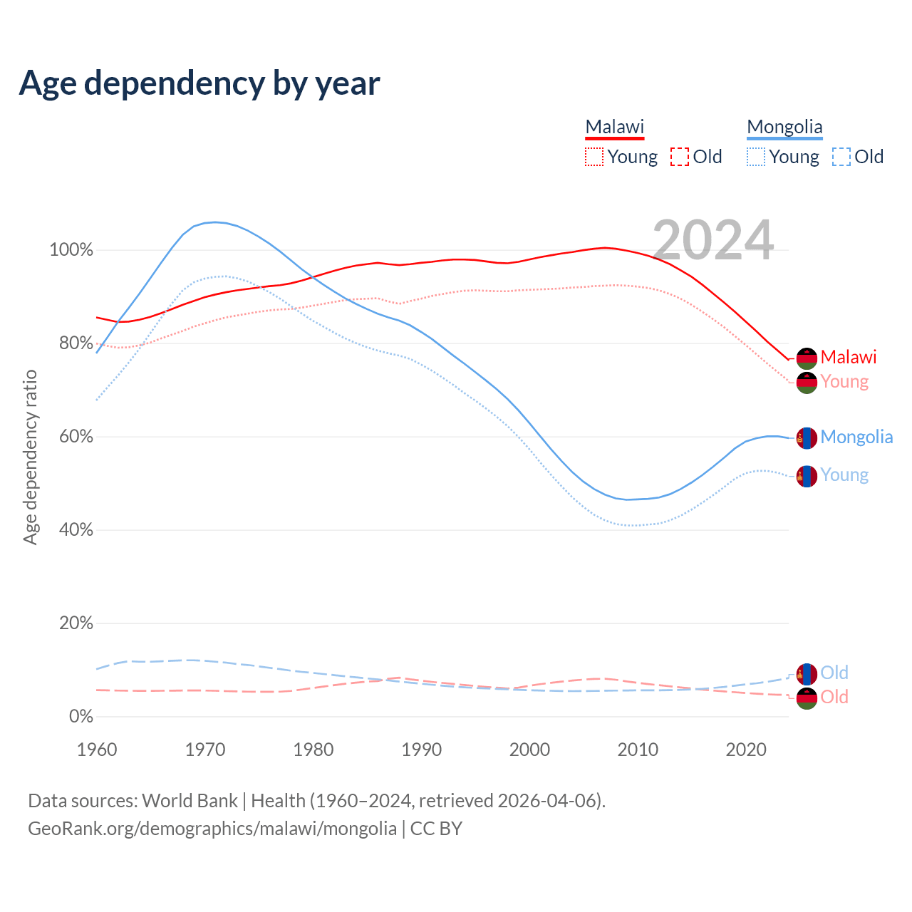 - Malawi is ranked 181/196 by median age (oldest to youngest) vs 117/196 for Mongolia.