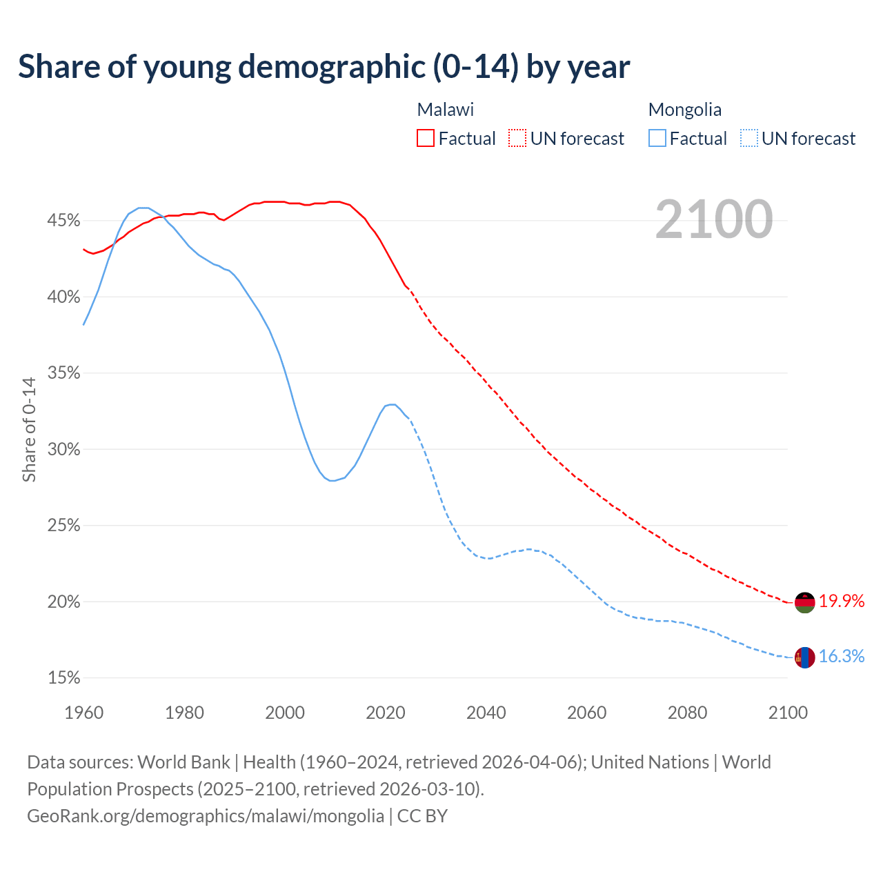 - The share of young demographic (0-15 years old) in Malawi is 40.7% vs 32.2% in Mongolia.