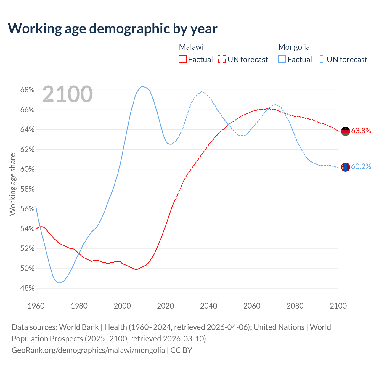 - Malawi has 13M working age adults (aged 15-64) vs 2.27M in Mongolia.