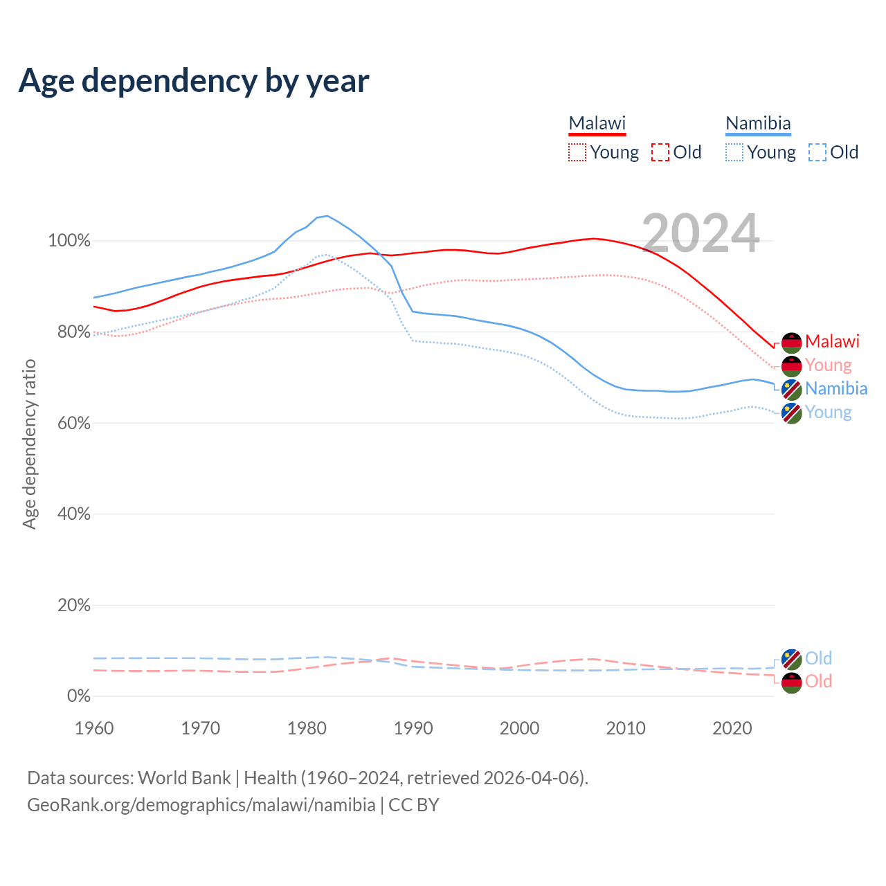 Data sources: World Bank | Health (1960–2024, retrieved 2026-04-06); U.S. Census Bureau (1960–2024, retrieved 2026-02-08).