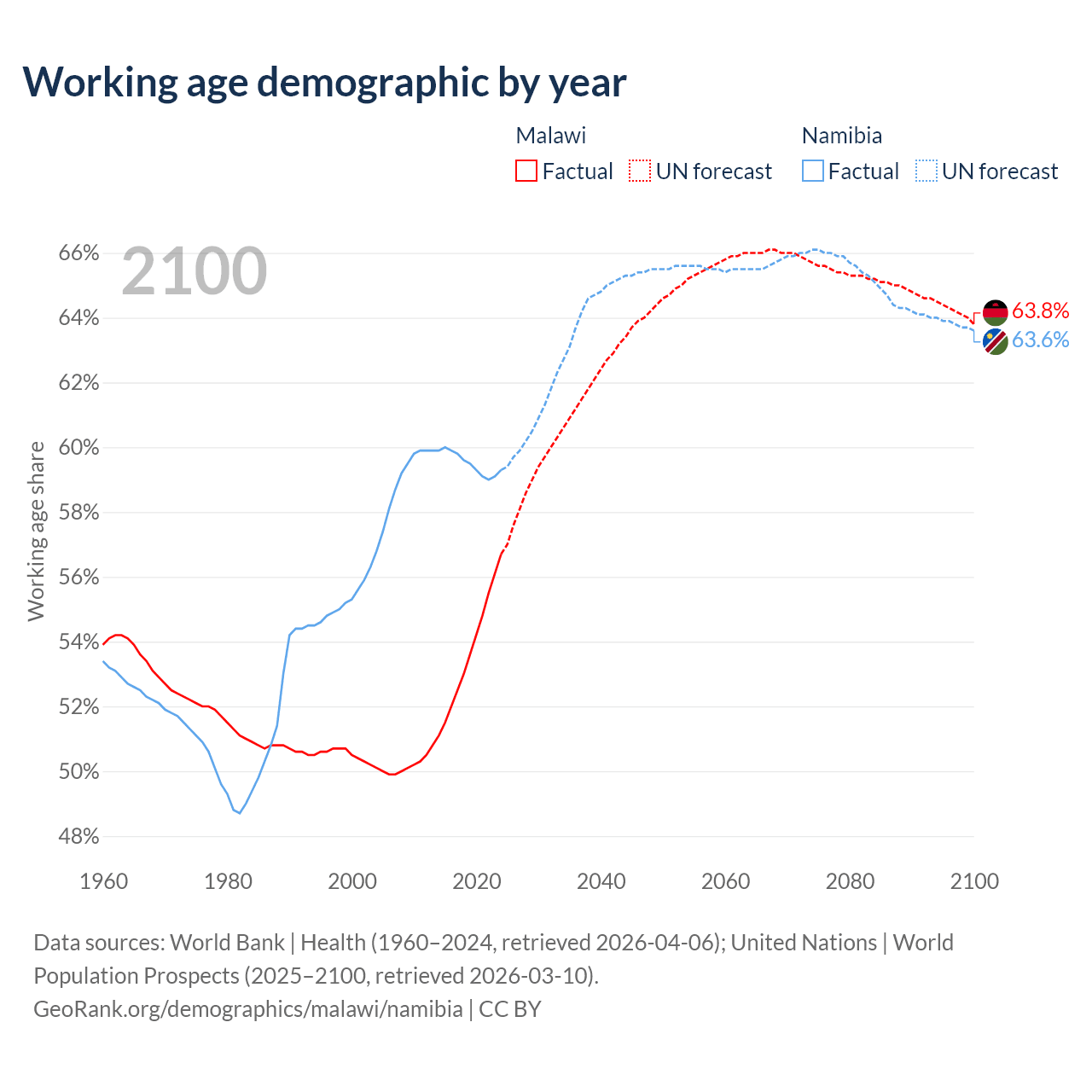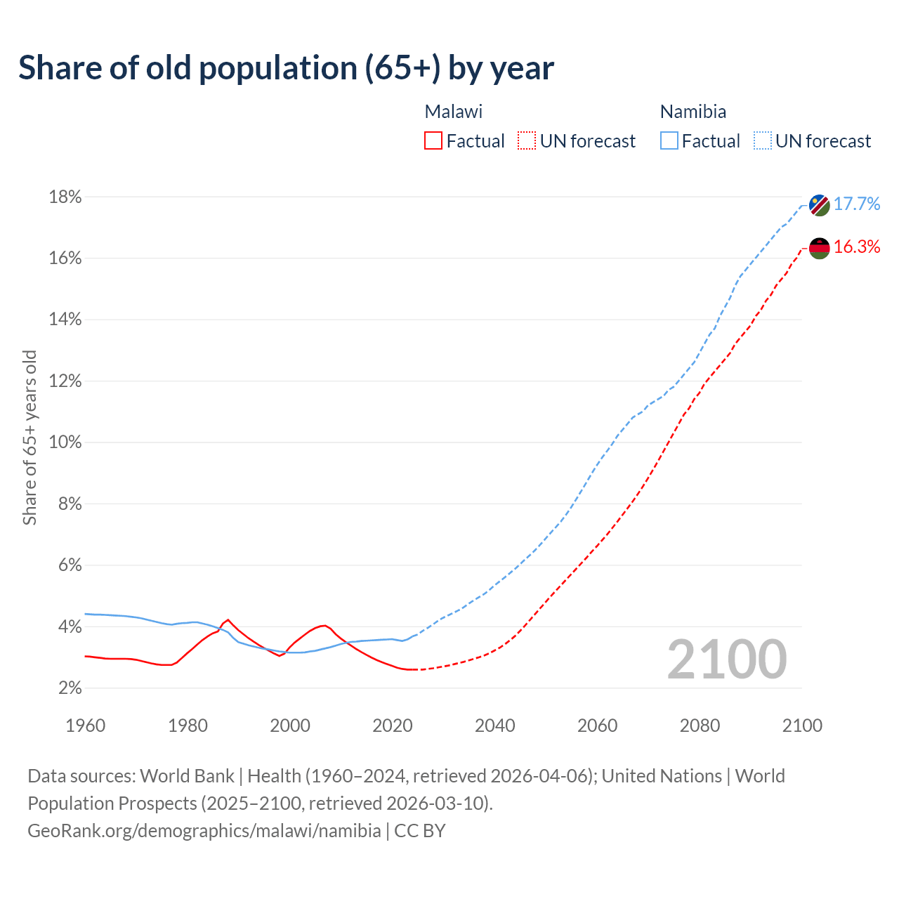 The share of older people aged 65 and over is 2.59% in Malawi and 3.67% in Namibia. Life expectancy in Malawi compared to Namibia .