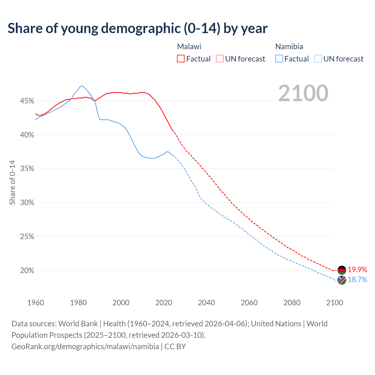 Median age Malawi vs Namibia, 1960-2100