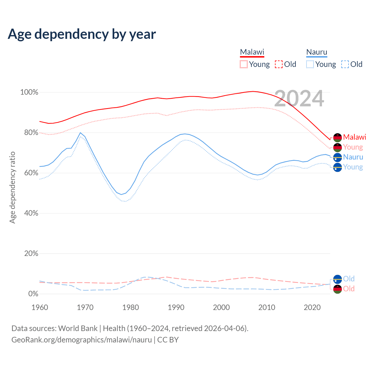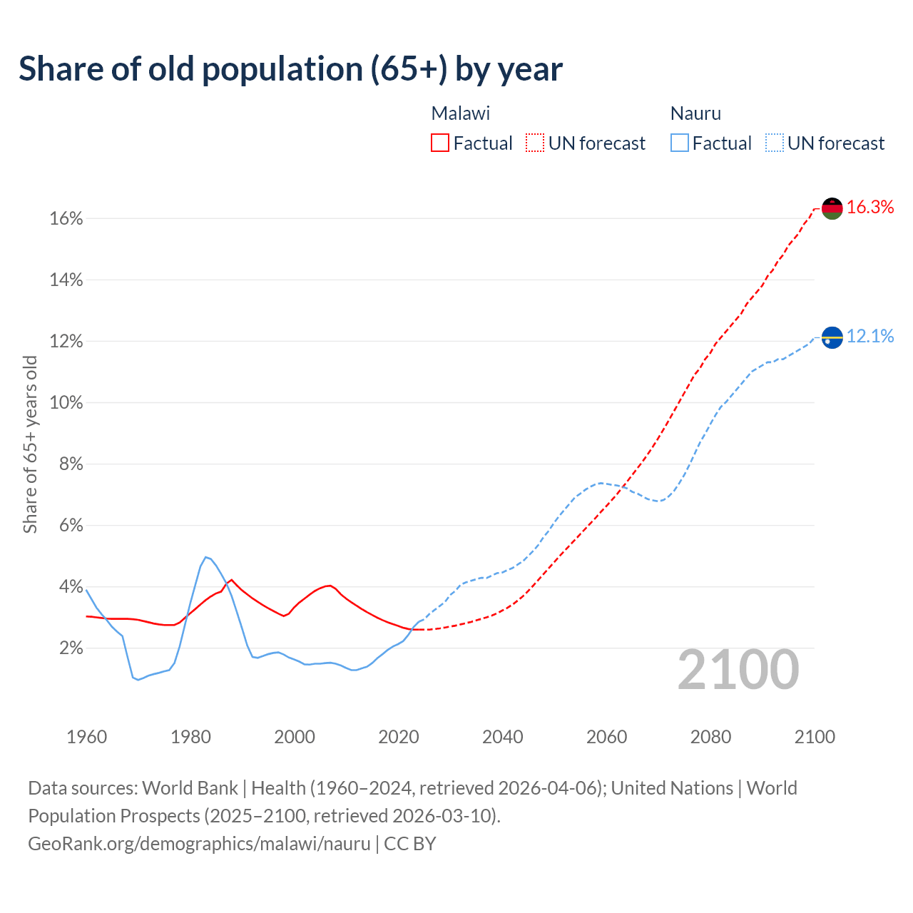 The share of older people aged 65 and over is 2.59% in Malawi and 2.85% in Nauru. Life expectancy in Malawi compared to Nauru .