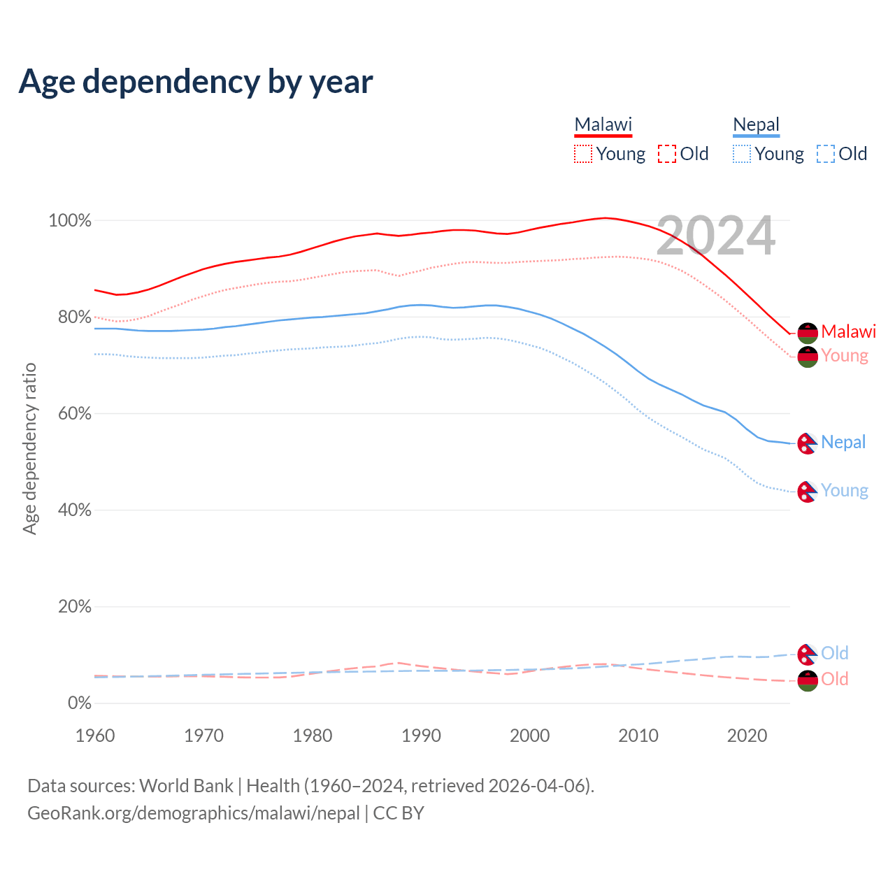 The share of older people aged 65 and over is 2.59% in Malawi and 6.5% in Nepal. Life expectancy in Malawi compared to Nepal .