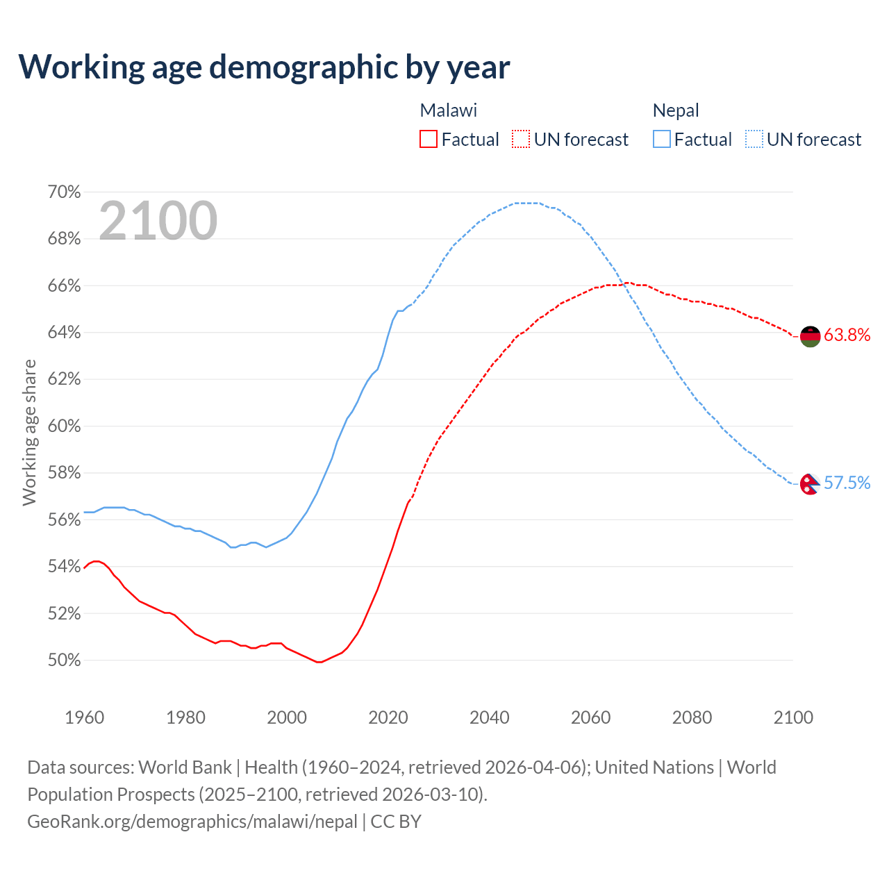 - Malawi has 13M working age adults (aged 15-64) vs 19.3M in Nepal.
