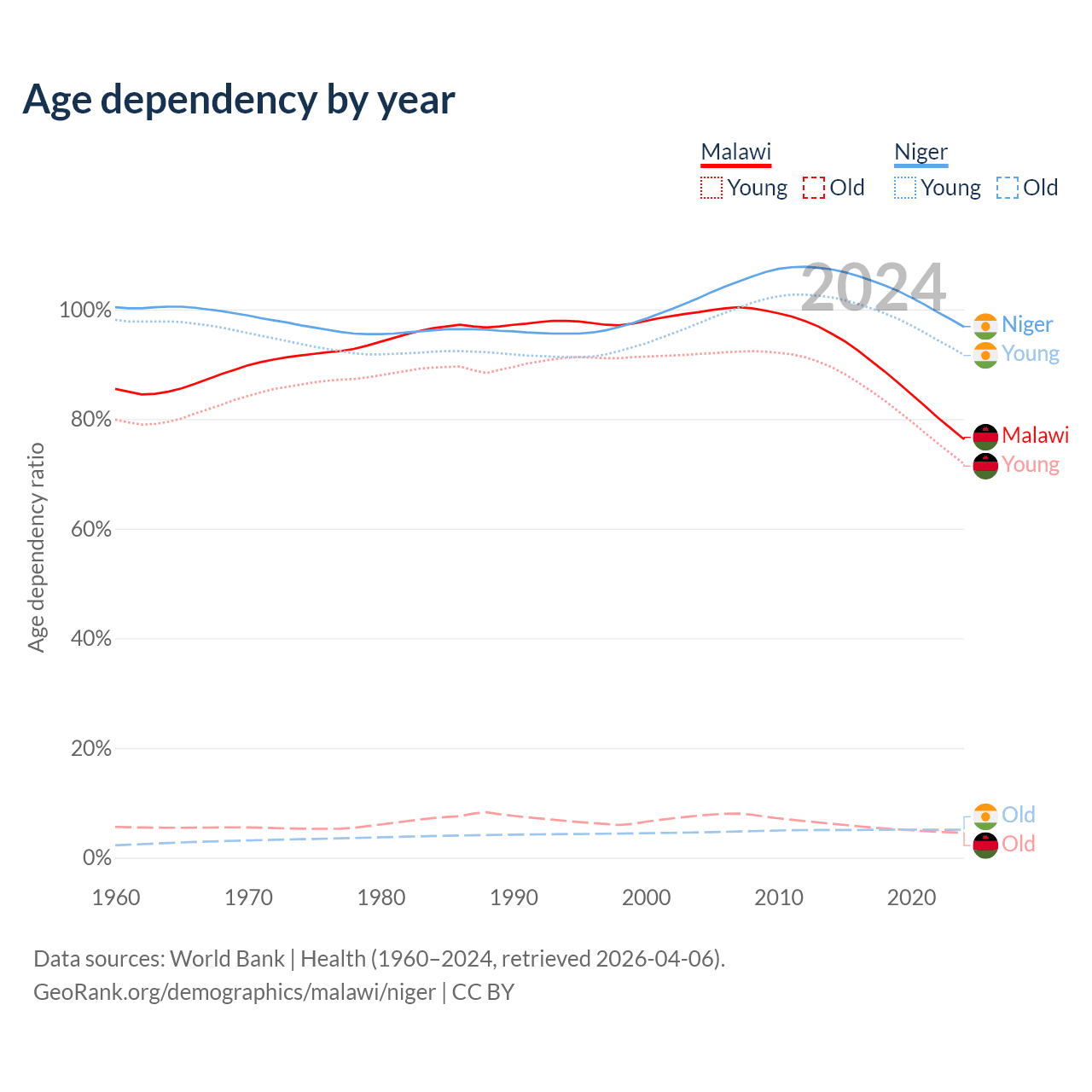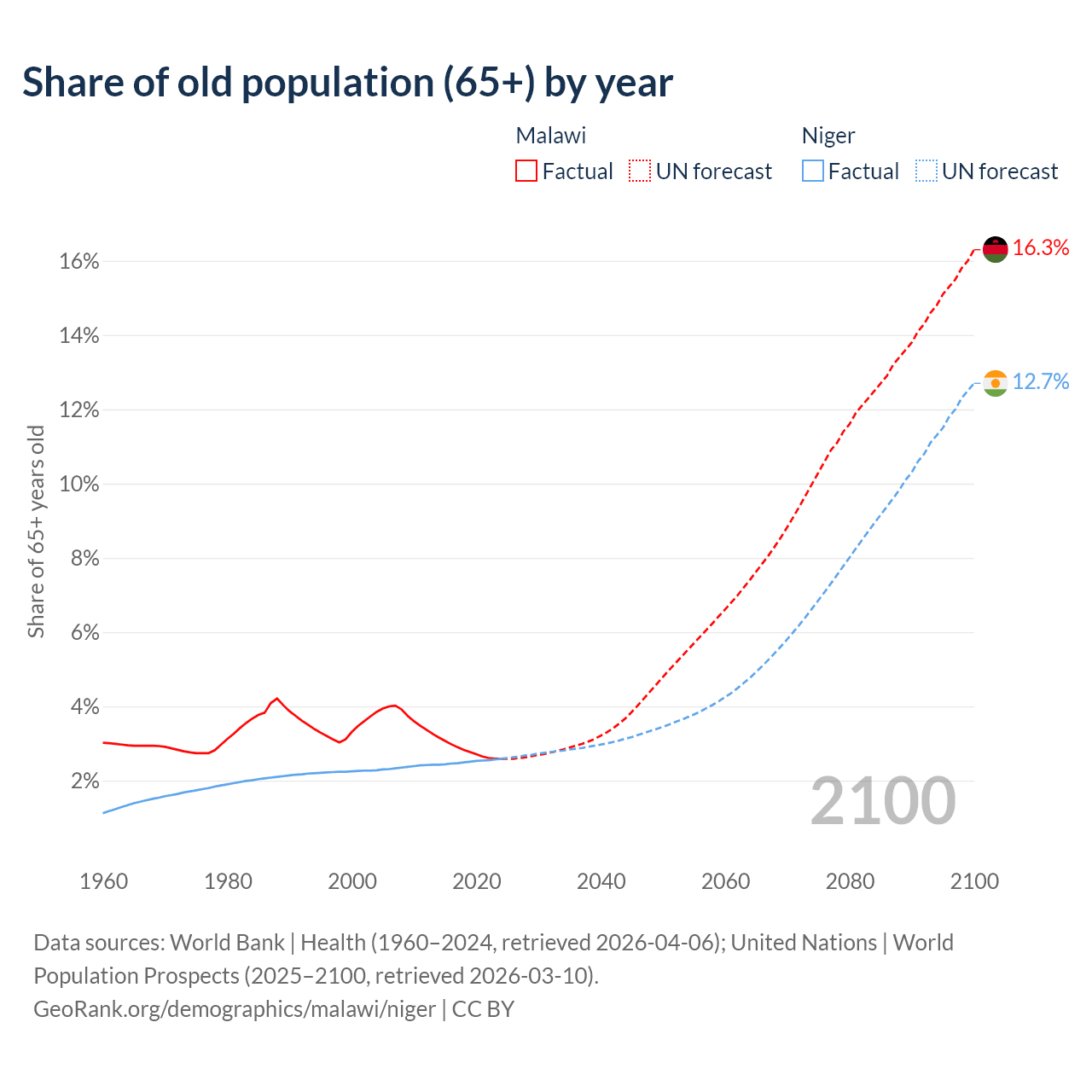 - The share of old-age demographic (65+) in Malawi is 2.59% vs 2.59% in Niger.