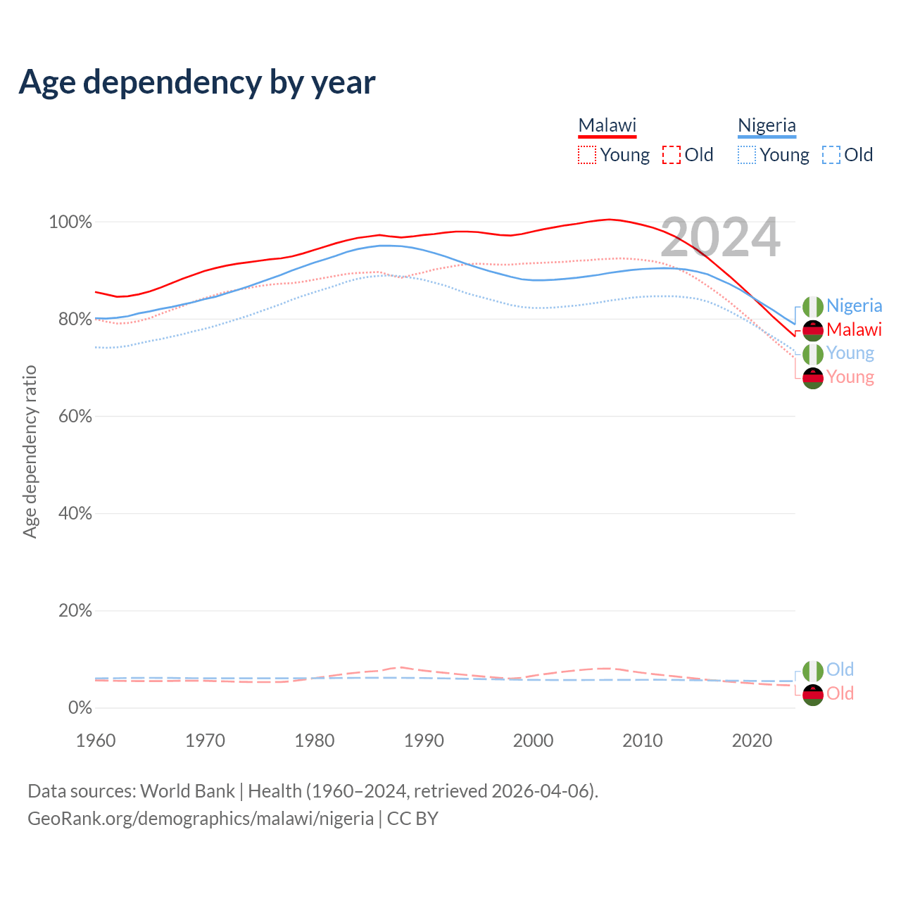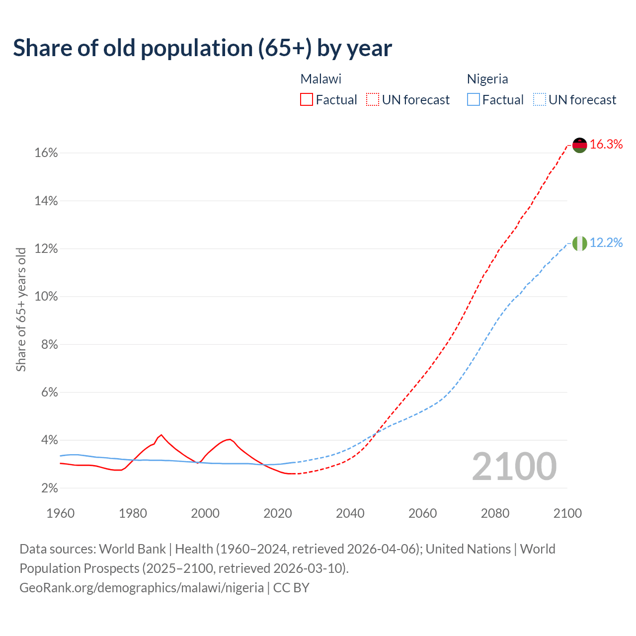 The share of older people aged 65 and over is 2.59% in Malawi and 3.05% in Nigeria. Life expectancy in Malawi compared to Nigeria .