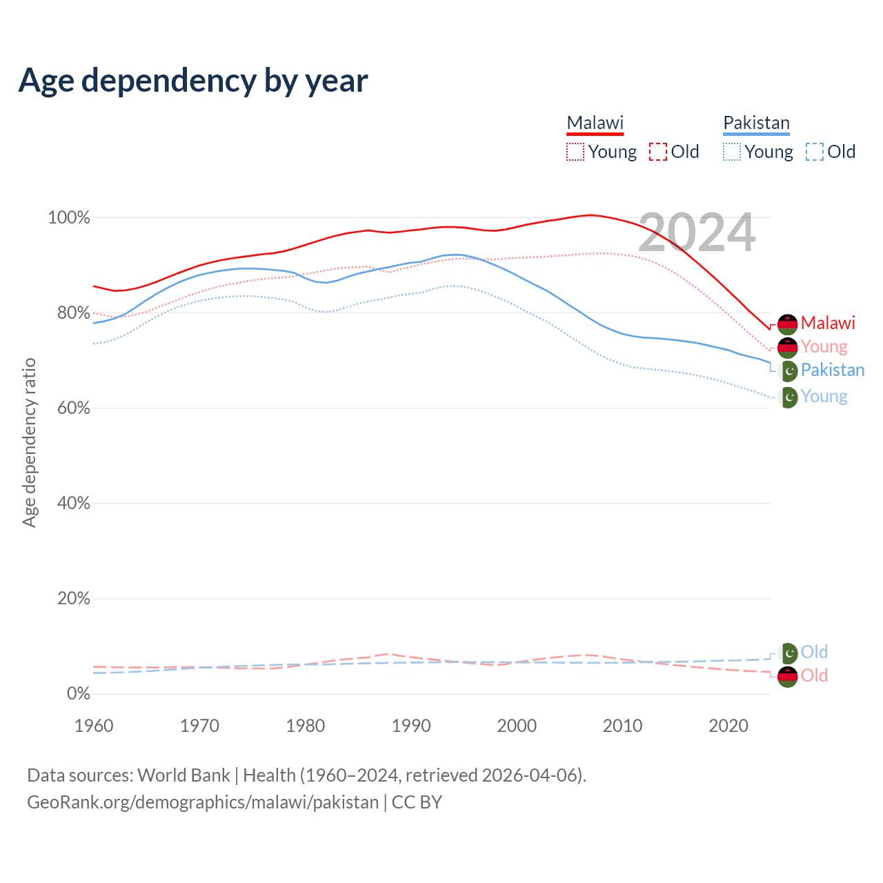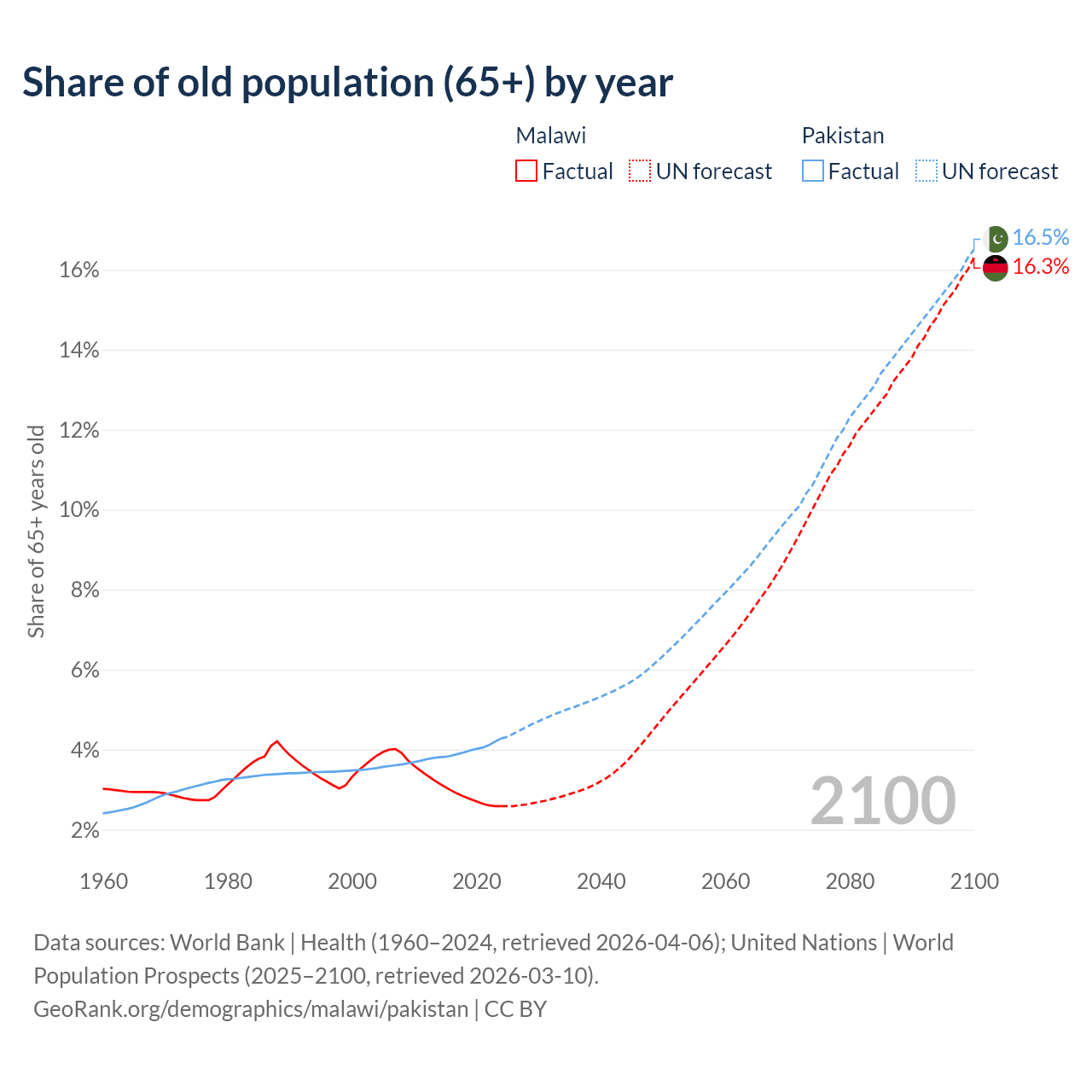 The share of older people aged 65 and over is 2.59% in Malawi and 4.28% in Pakistan. Life expectancy in Malawi compared to Pakistan .