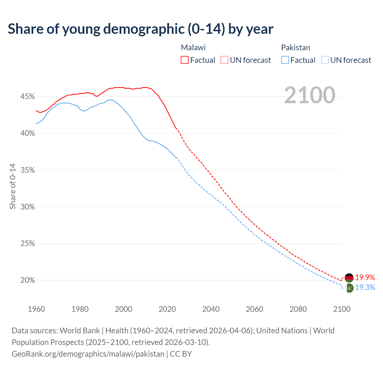- The share of young demographic (0-15 years old) in Malawi is 40.7% vs 36.7% in Pakistan.