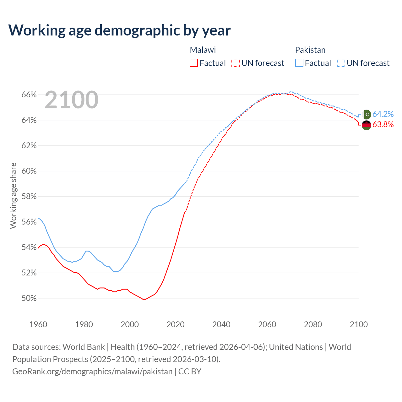 - Malawi has 13M working age adults (aged 15-64) vs 154M in Pakistan.