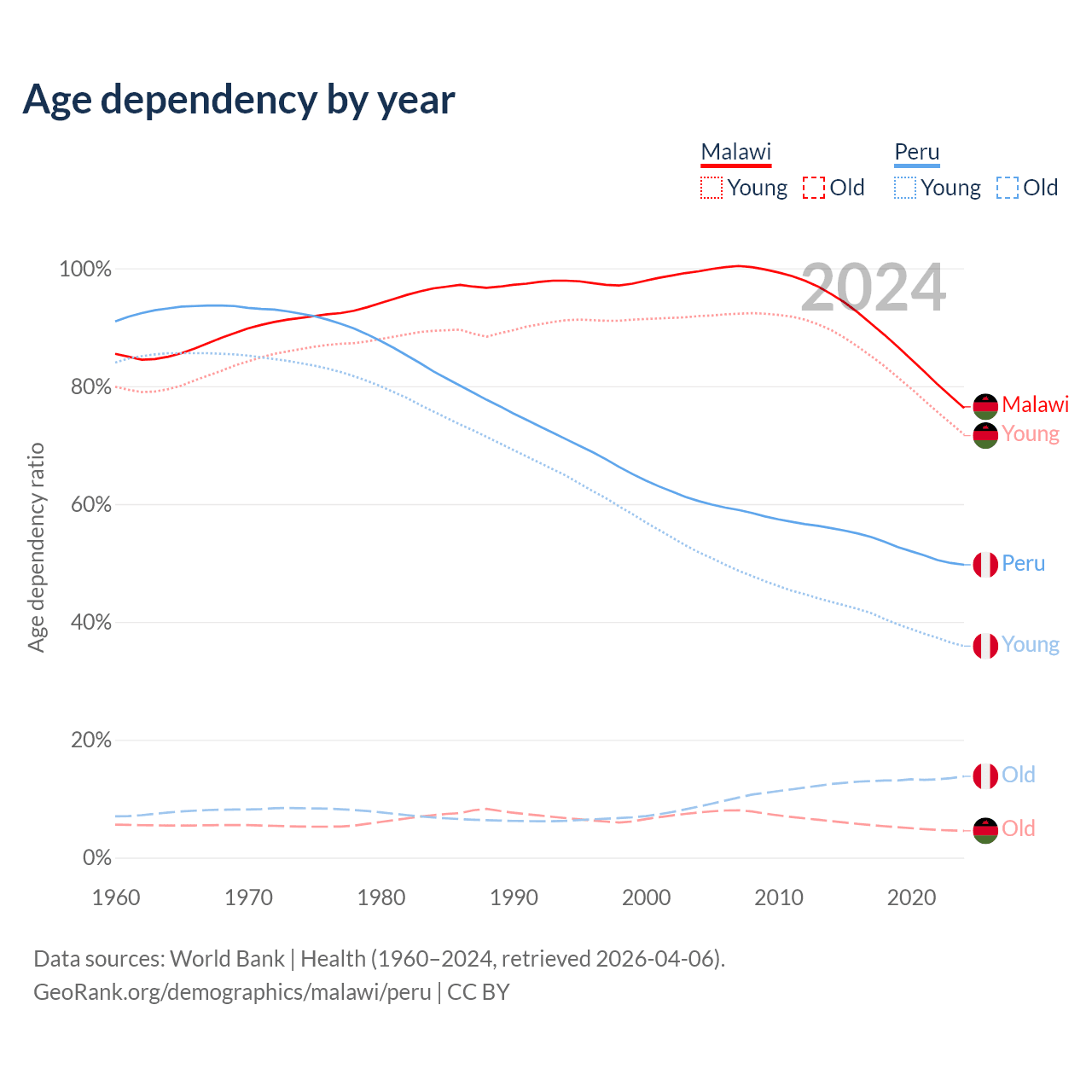 - Malawi is ranked 181/196 by median age (oldest to youngest) vs 97/196 for Peru.