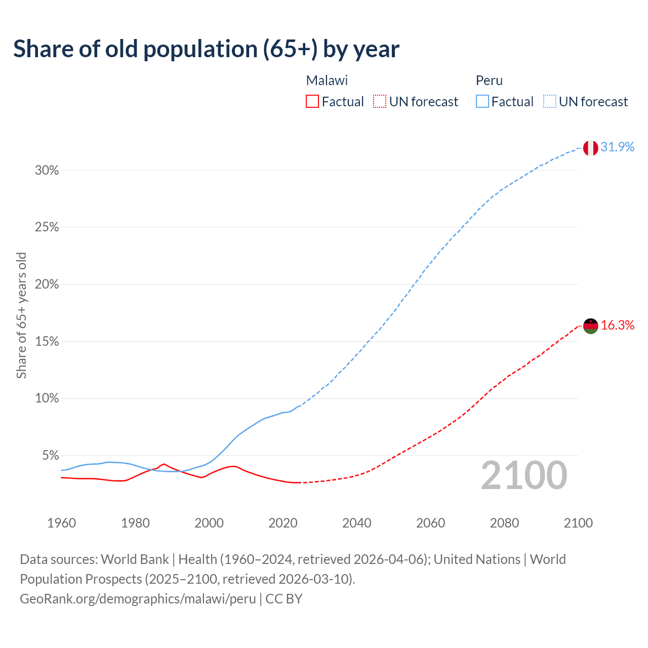 The share of older people aged 65 and over is 2.59% in Malawi and 9.23% in Peru. Life expectancy in Malawi compared to Peru .
