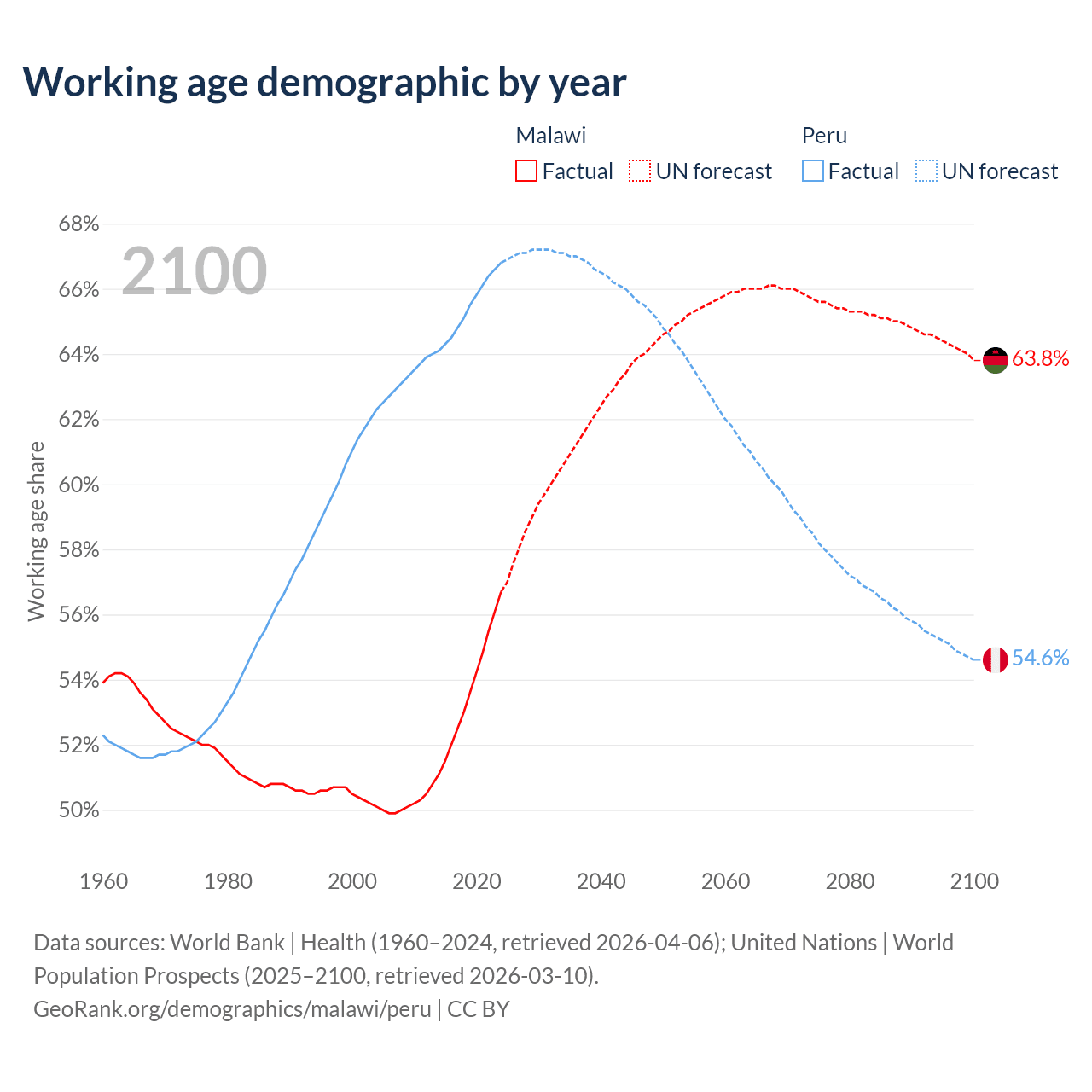 - Malawi has 13M working age adults (aged 15-64) vs 23.4M in Peru.