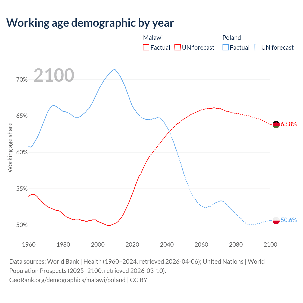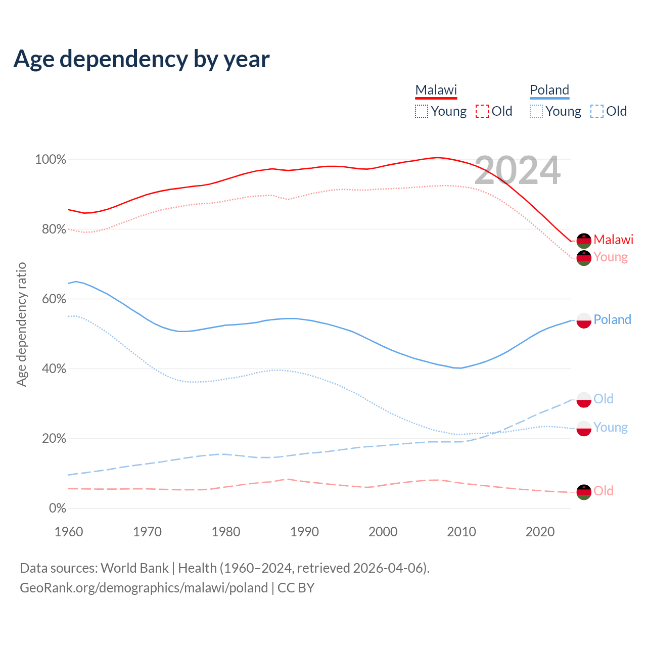 The share of older people aged 65 and over is 2.59% in Malawi and 20.1% in Poland. Life expectancy in Malawi compared to Poland .