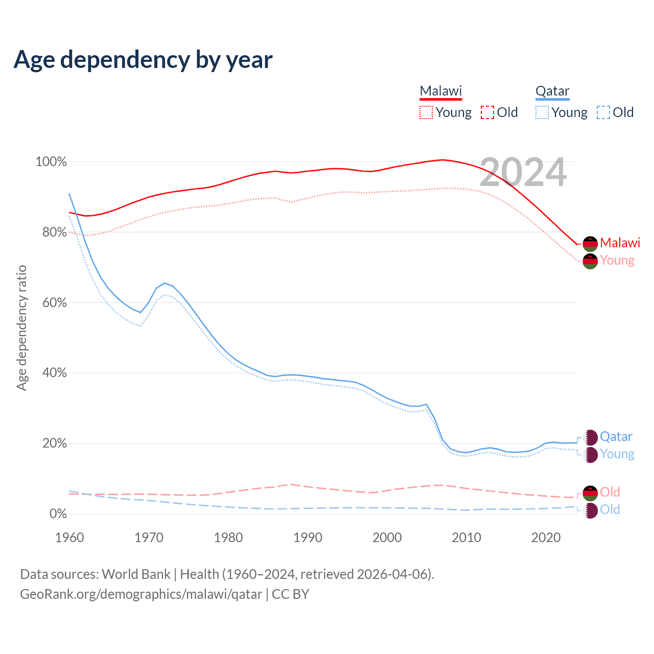 - Malawi is ranked 181/196 by median age (oldest to youngest) vs 78/196 for Qatar.