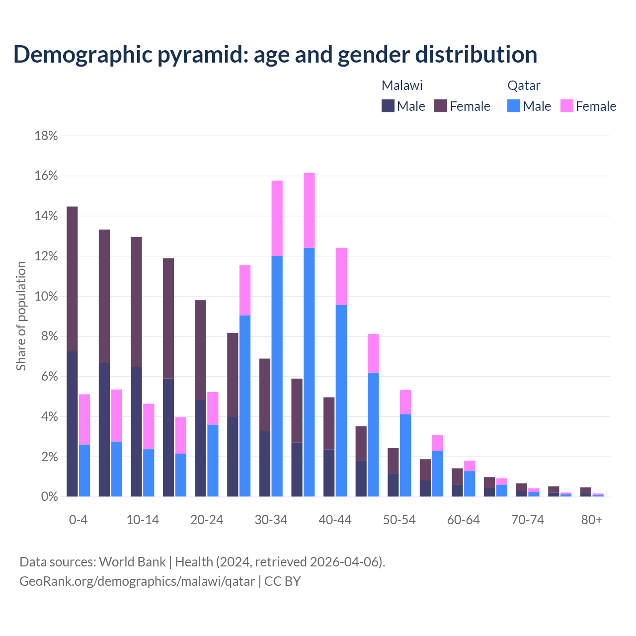 - As of 2026, the population of Malawi is 22.9M vs 3M in Qatar - 7.65 times difference.