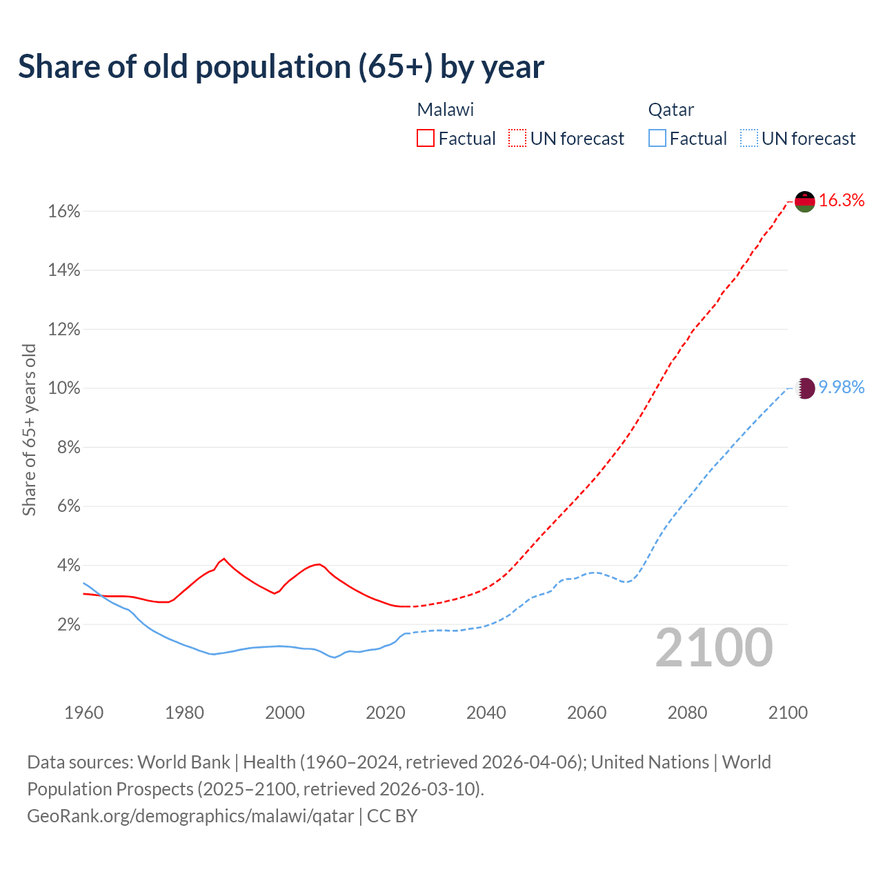 The share of older people aged 65 and over is 2.59% in Malawi and 1.68% in Qatar. Life expectancy in Malawi compared to Qatar .