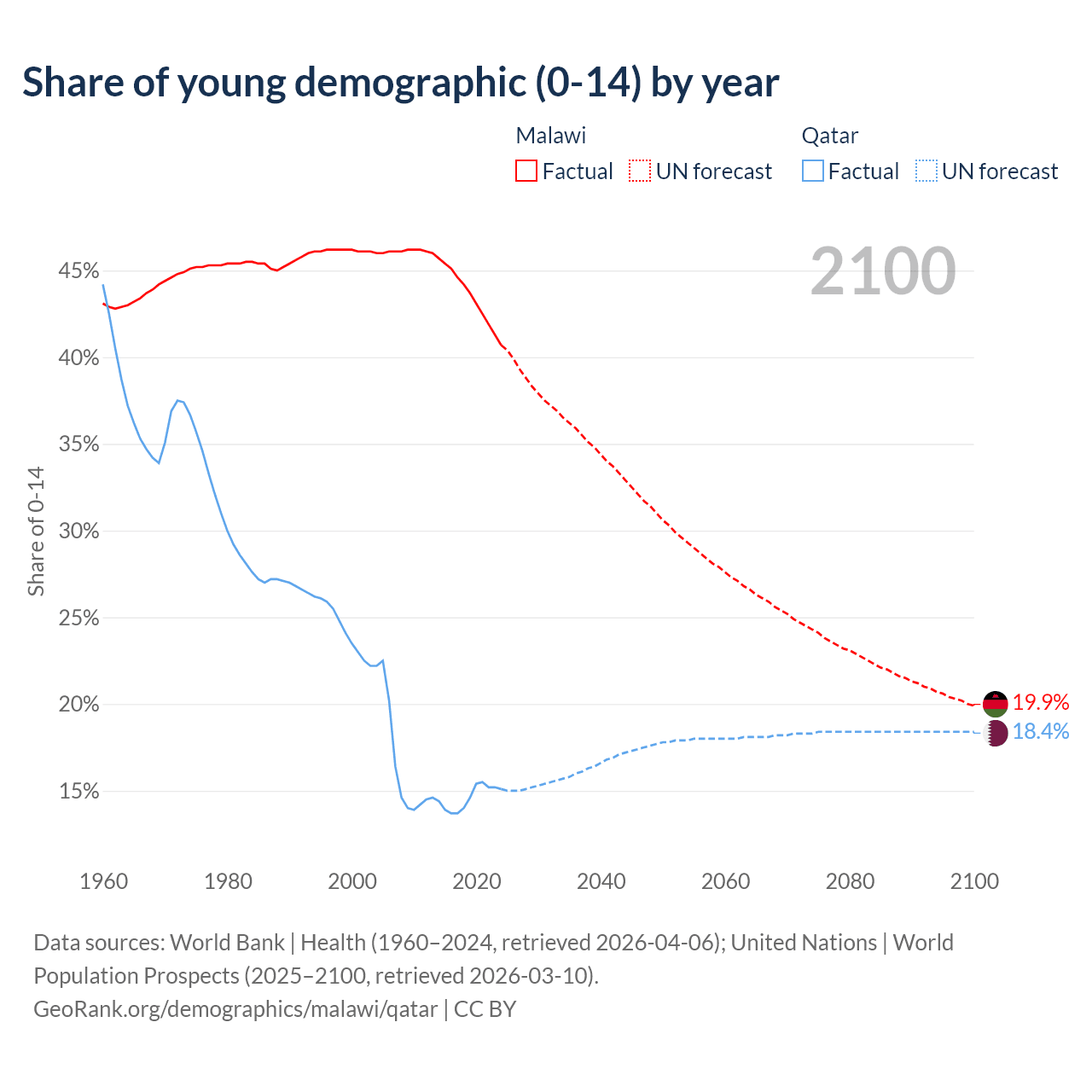 - The share of young demographic (0-15 years old) in Malawi is 40.7% vs 15.1% in Qatar.