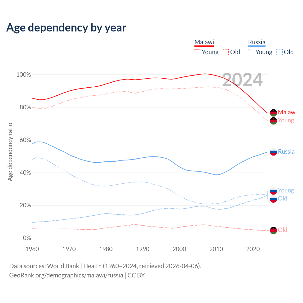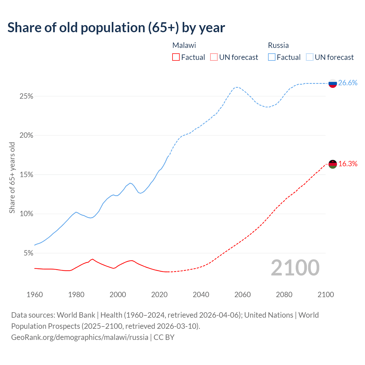 The share of older people aged 65 and over is 2.59% in Malawi and 17.2% in Russia. Life expectancy in Malawi compared to Russia .