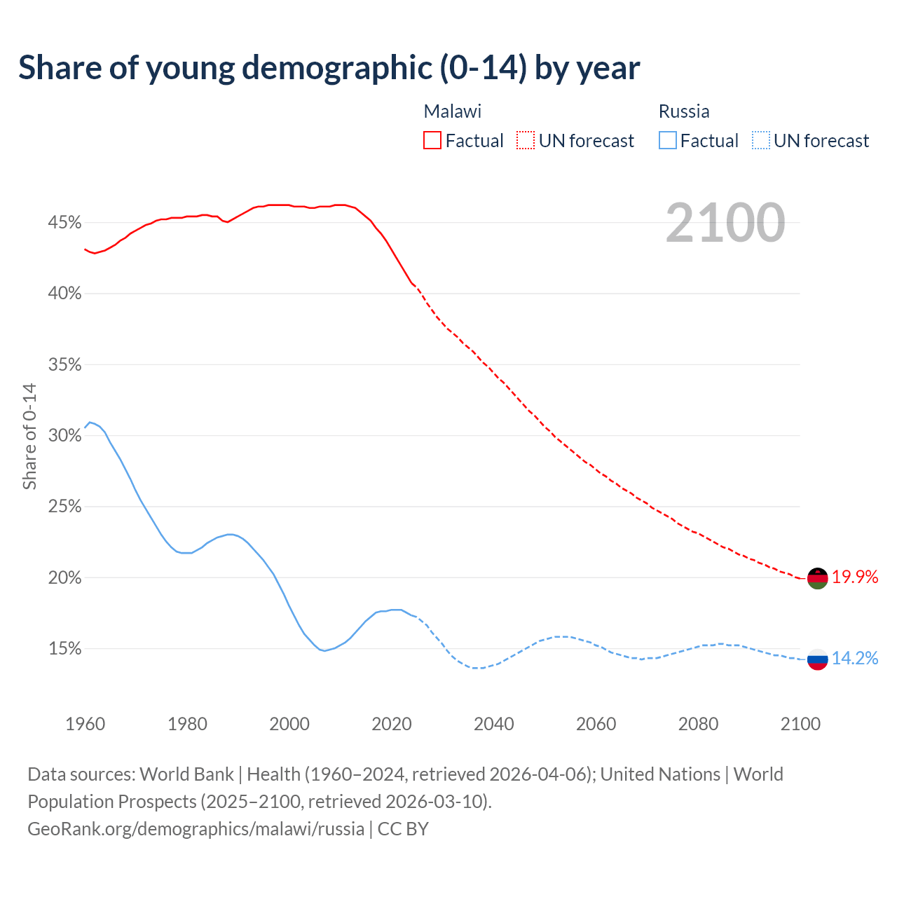 - The share of young demographic (0-15 years old) in Malawi is 40.7% vs 17.3% in Russia.