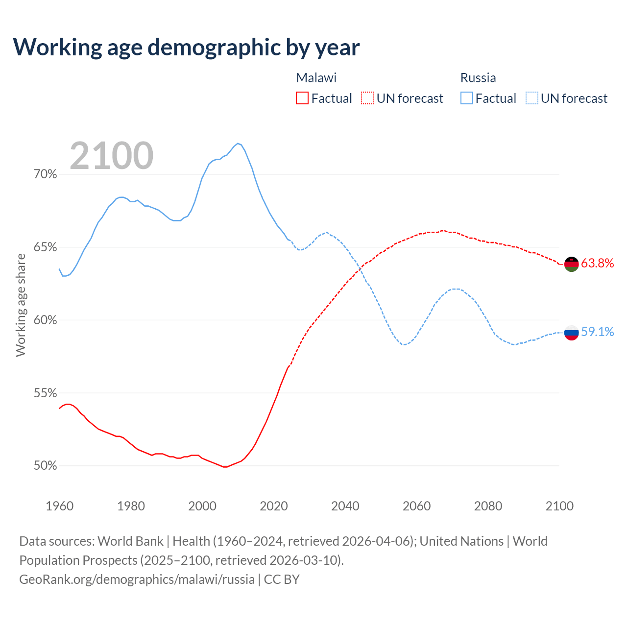 - Malawi has 13M working age adults (aged 15-64) vs 93M in Russia.