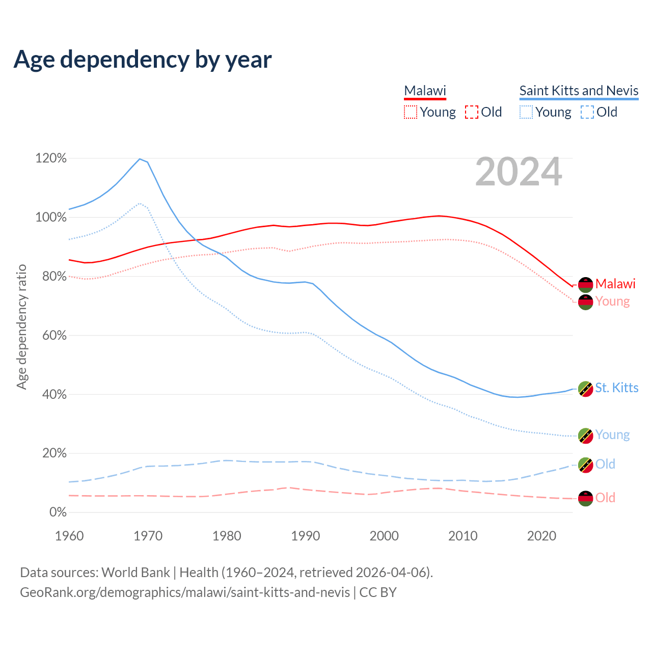 - The share of old-age demographic (65+) in Malawi is 2.59% vs 11.2% in Saint Kitts and Nevis.