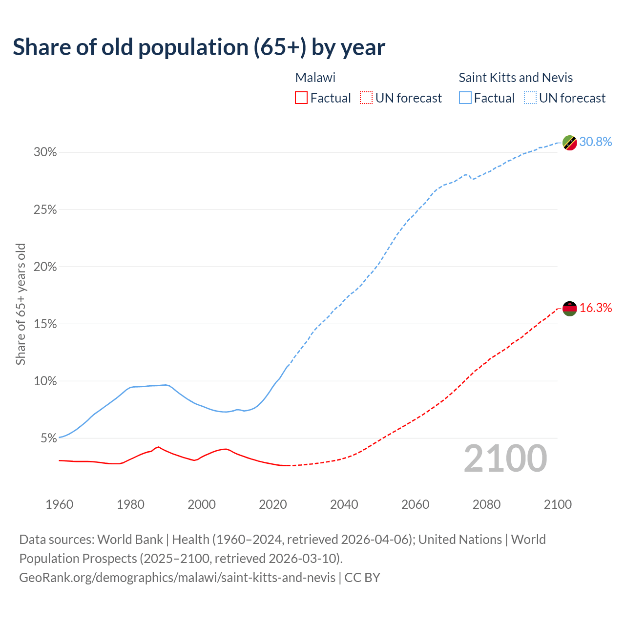 The share of older people aged 65 and over is 2.59% in Malawi and 11.2% in Saint Kitts and Nevis. Life expectancy in Malawi compared to Saint Kitts and Nevis .