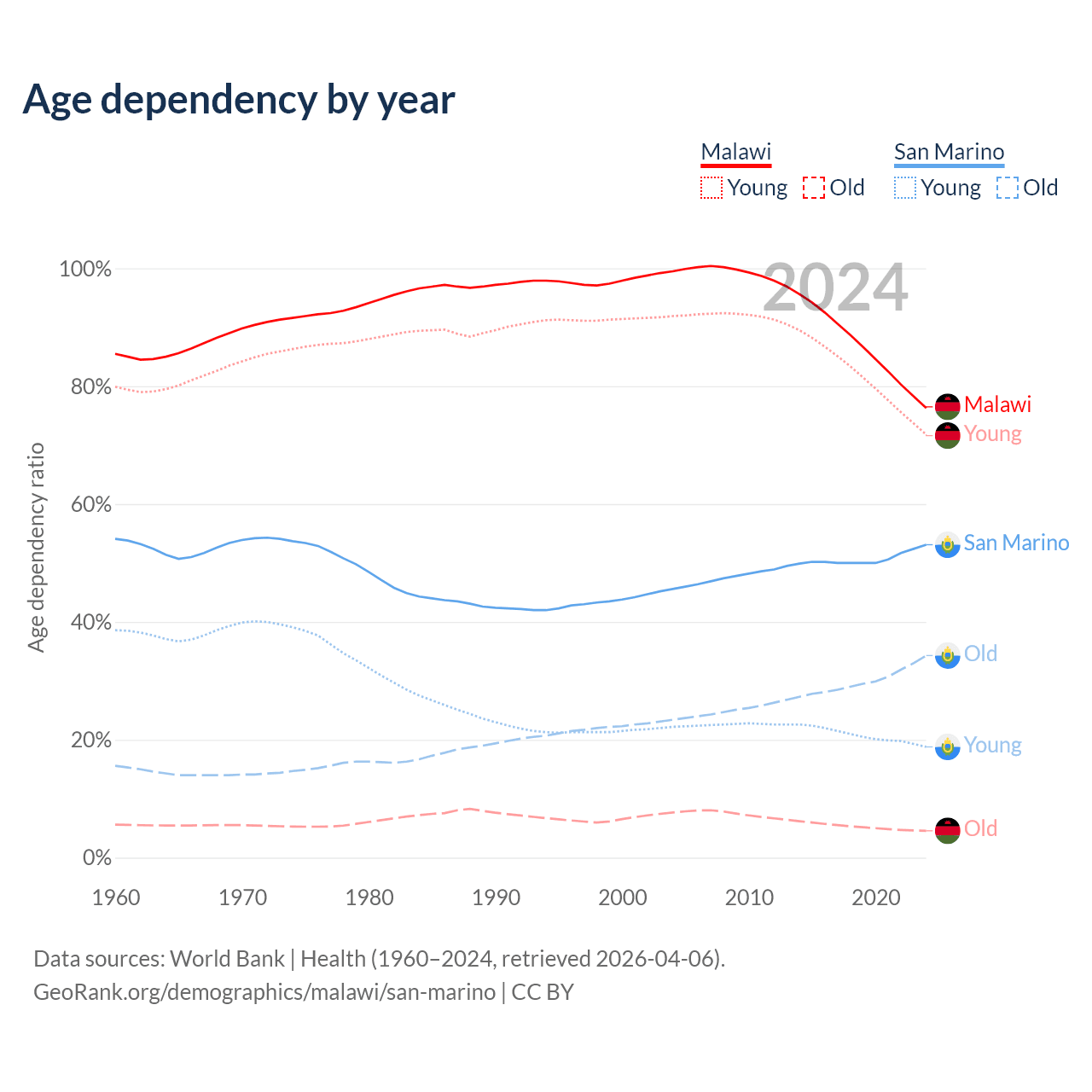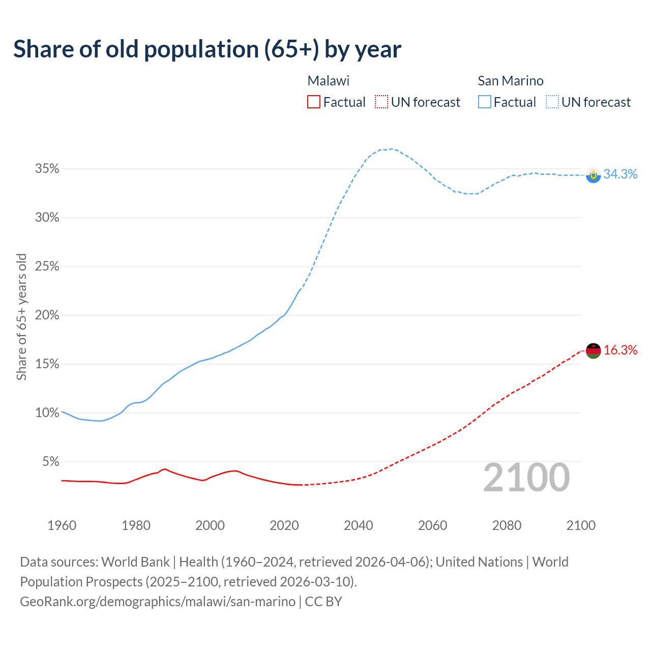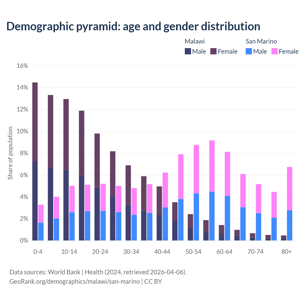 - The share of old-age demographic (65+) in Malawi is 2.59% vs 22.4% in San Marino.