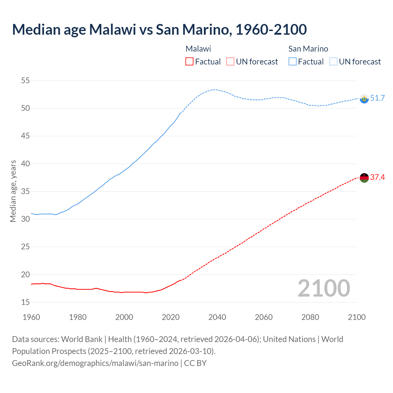 Median age Malawi vs San Marino, 1960-2100