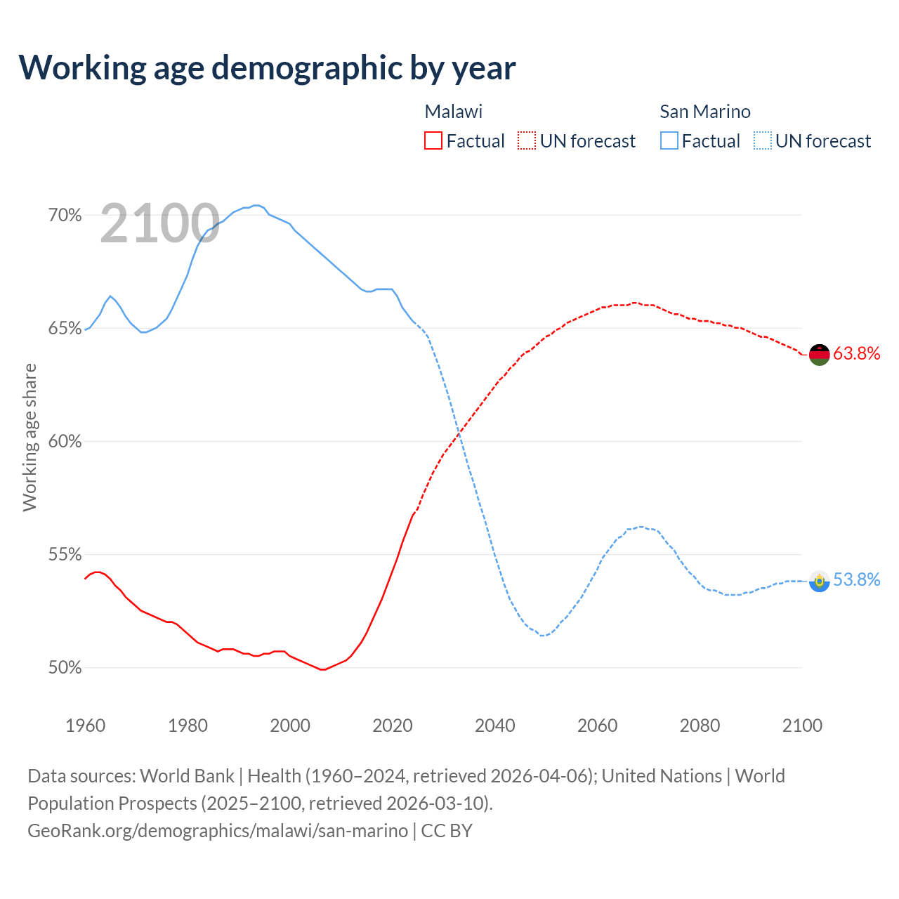 - Malawi has 13M working age adults (aged 15-64) vs 22.2K in San Marino.