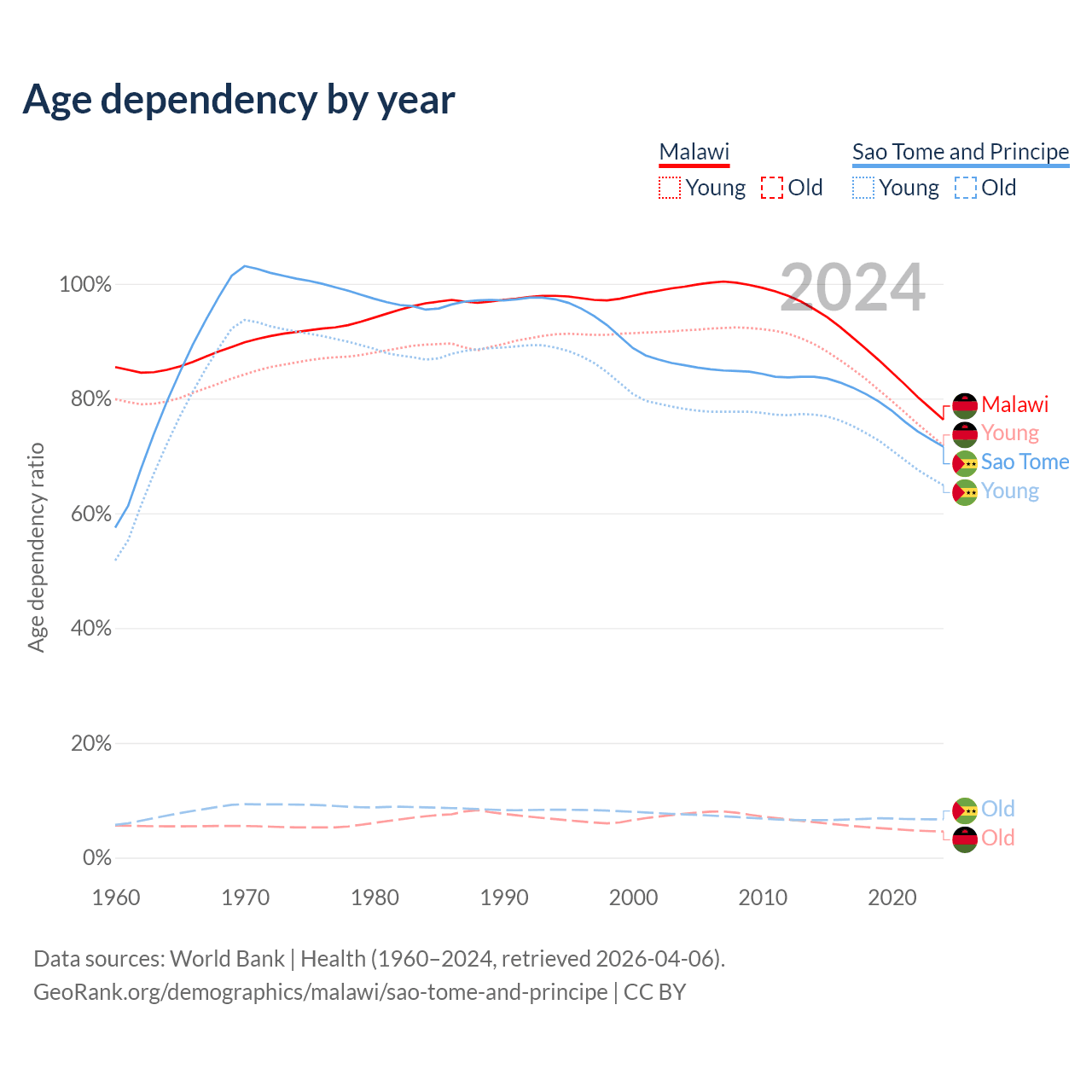 - Malawi is ranked 181/196 by median age (oldest to youngest) vs 163/196 for Sao Tome and Principe.