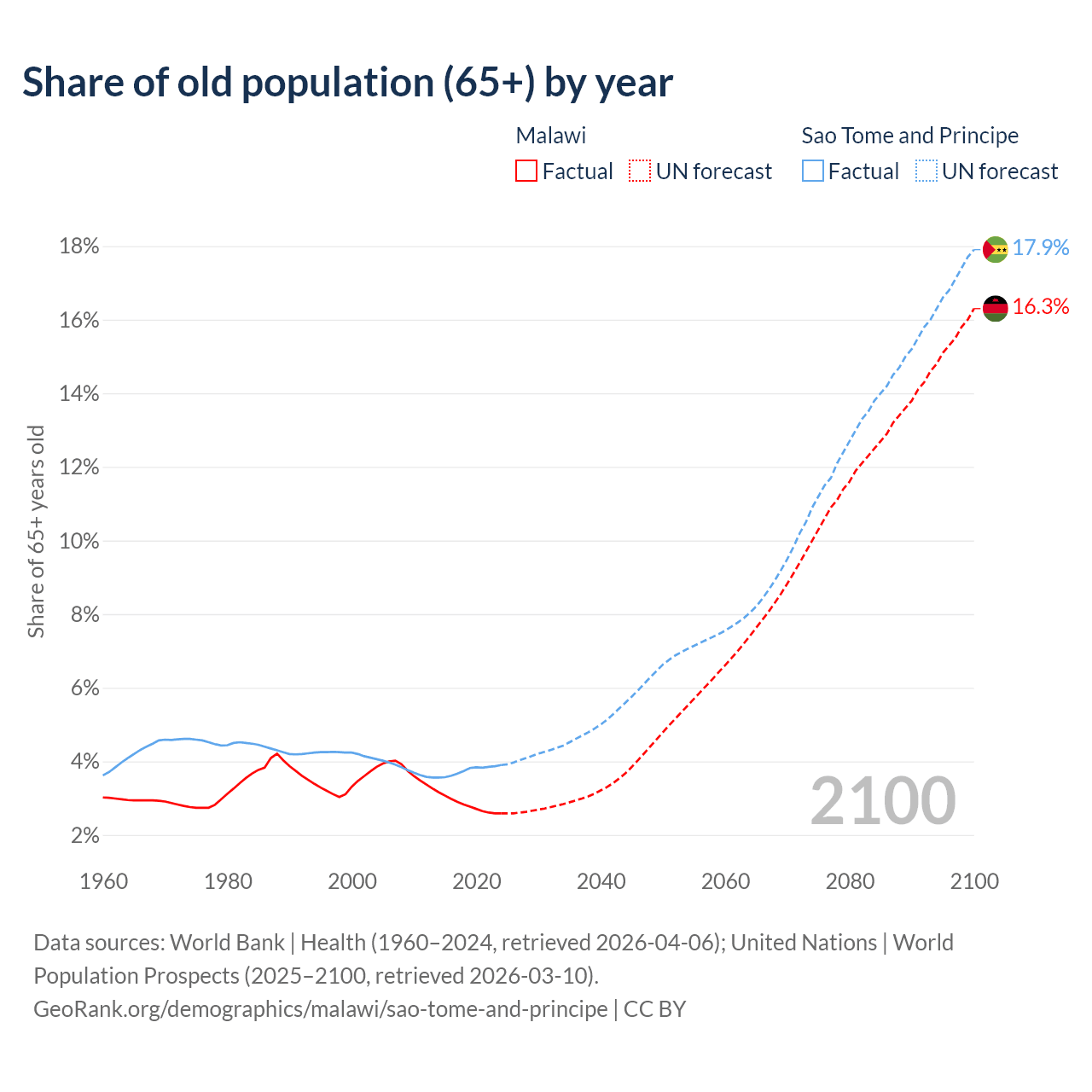 The share of older people aged 65 and over is 2.59% in Malawi and 3.9% in Sao Tome and Principe. Life expectancy in Malawi compared to Sao Tome and Principe .