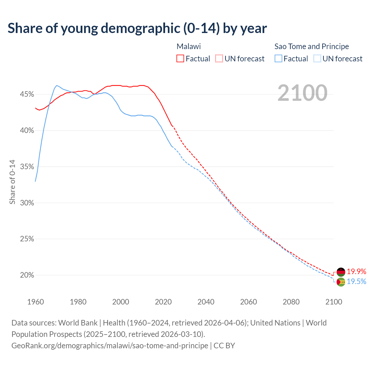 - The share of young demographic (0-15 years old) in Malawi is 40.7% vs 37.8% in Sao Tome and Principe.