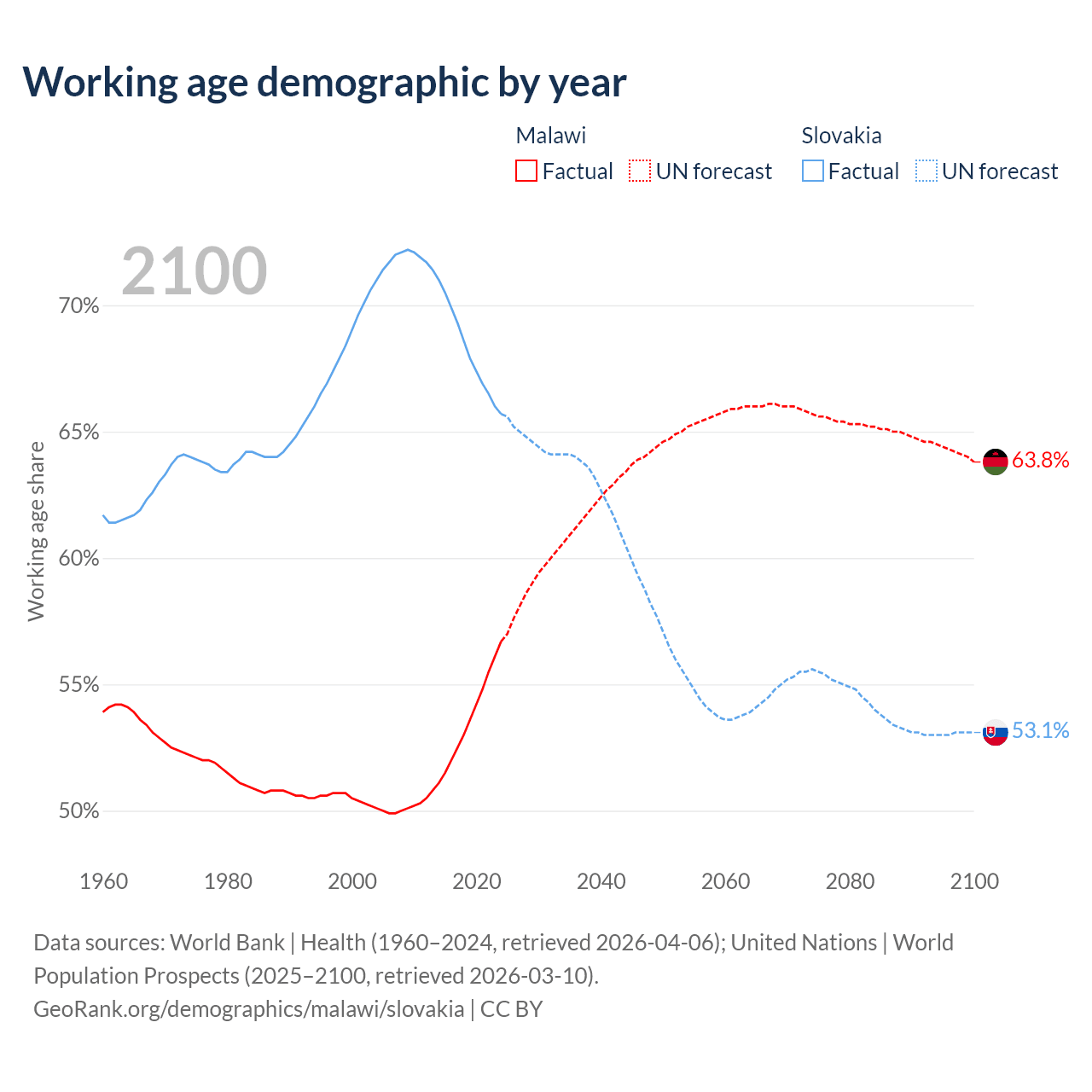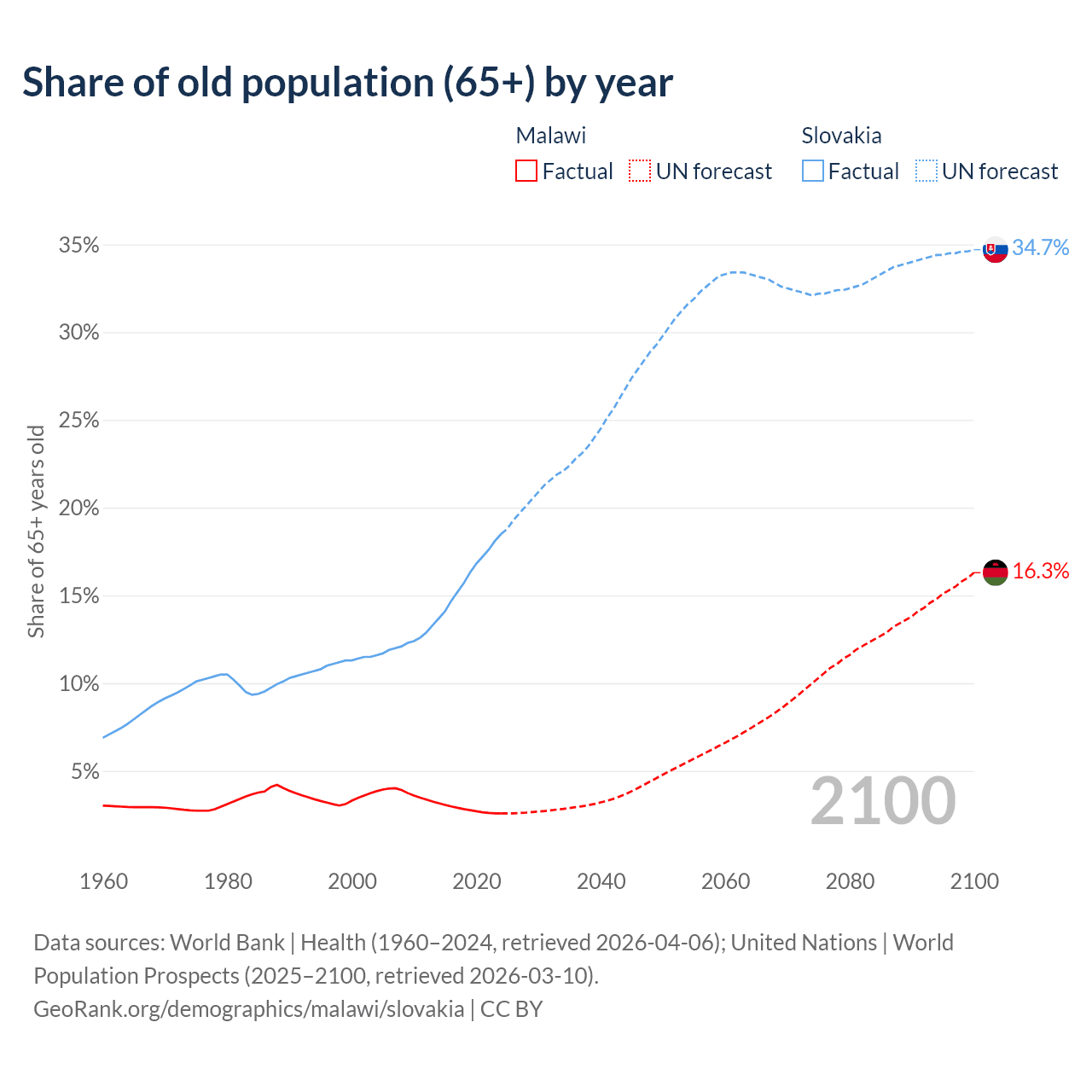 The share of older people aged 65 and over is 2.59% in Malawi and 18.5% in Slovakia. Life expectancy in Malawi compared to Slovakia .