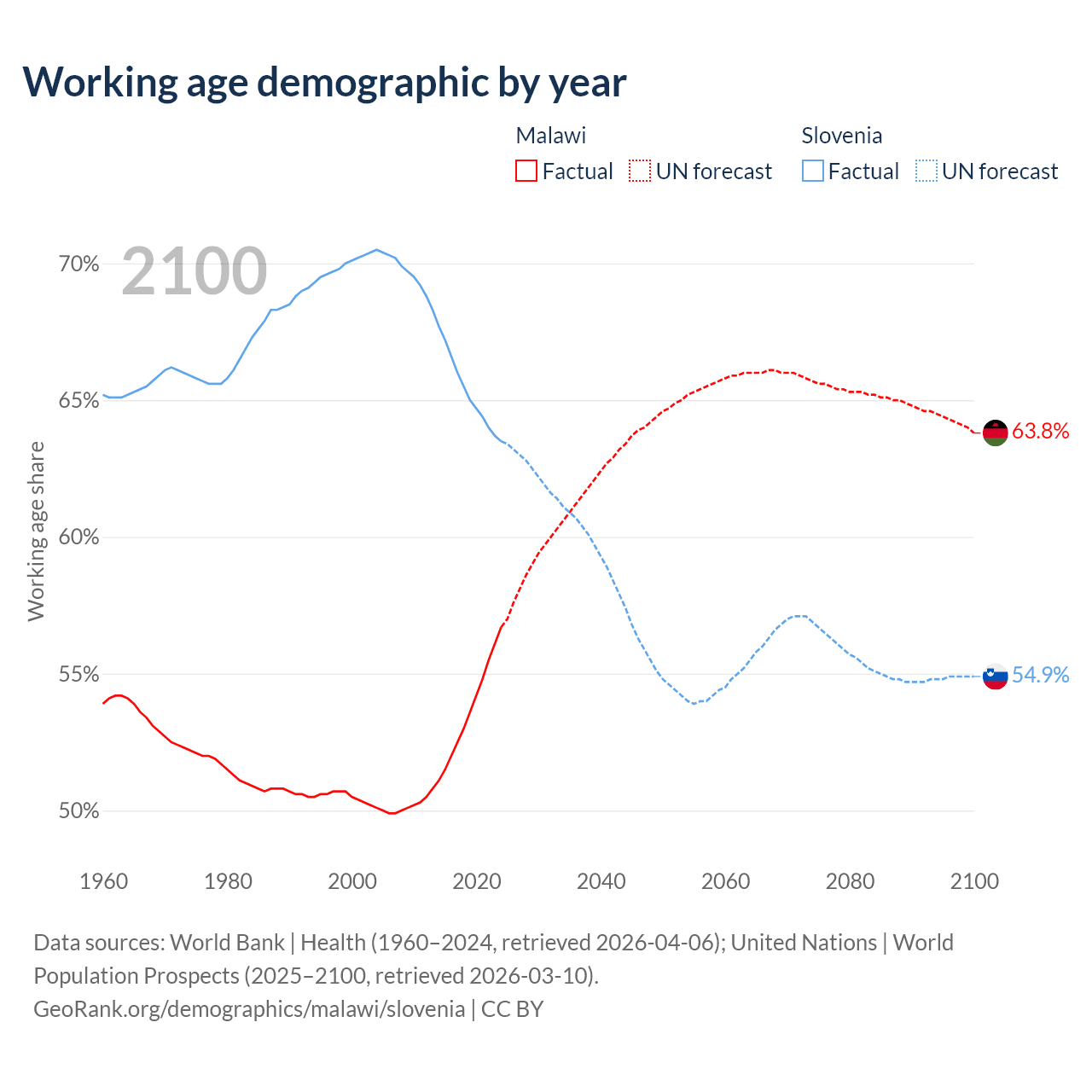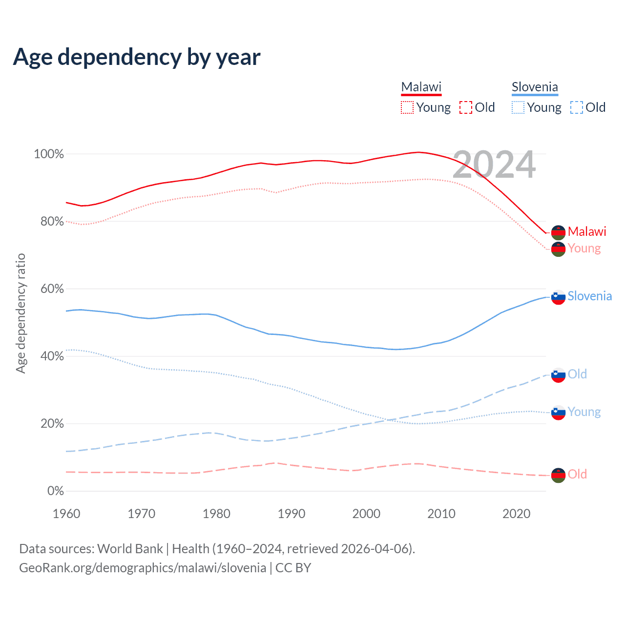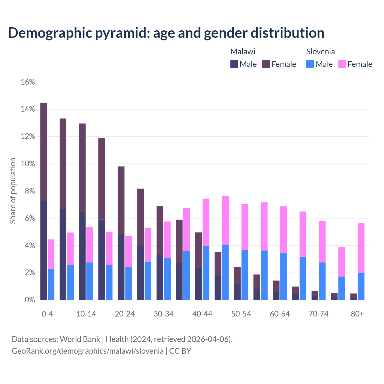 - The share of old-age demographic (65+) in Malawi is 2.59% vs 21.8% in Slovenia.
