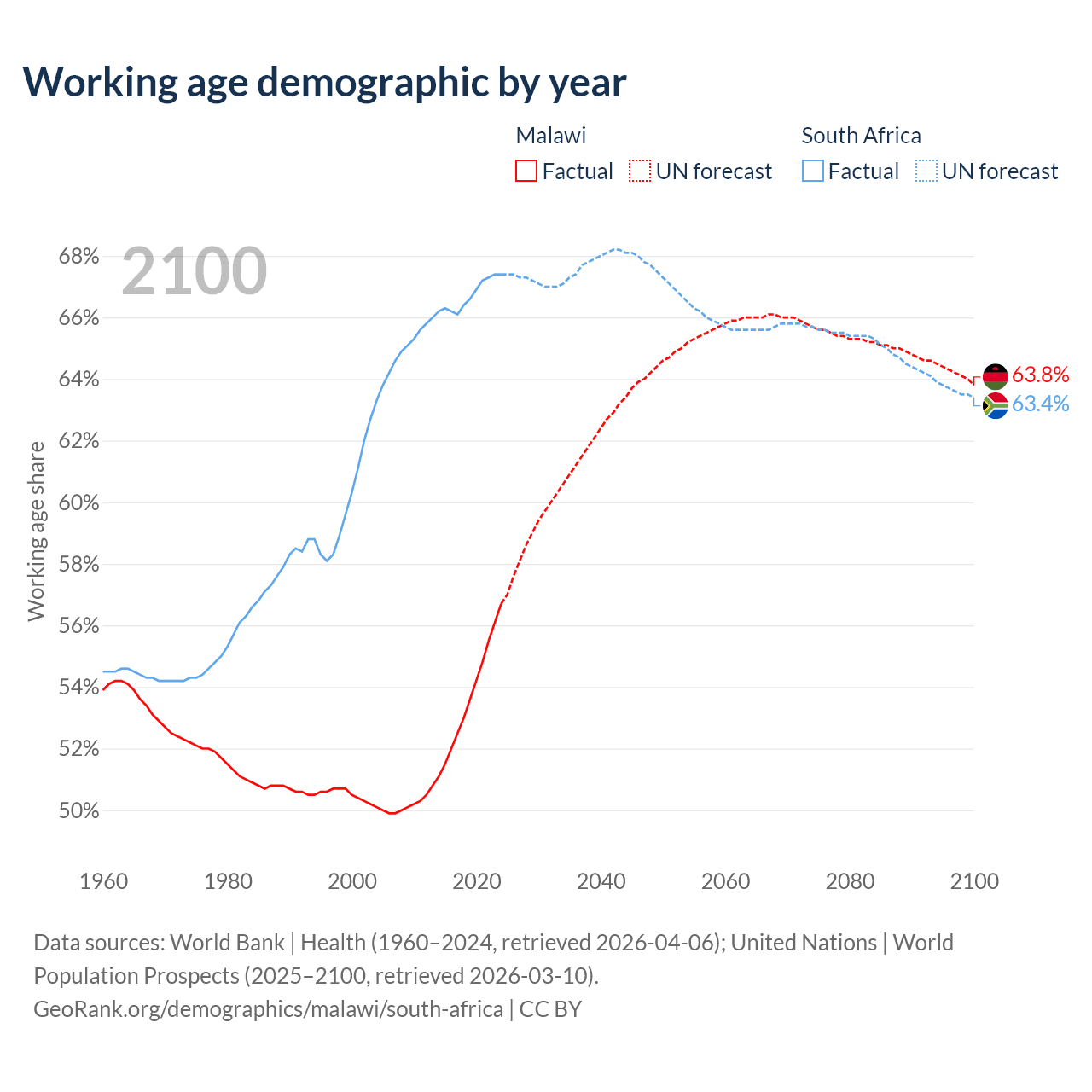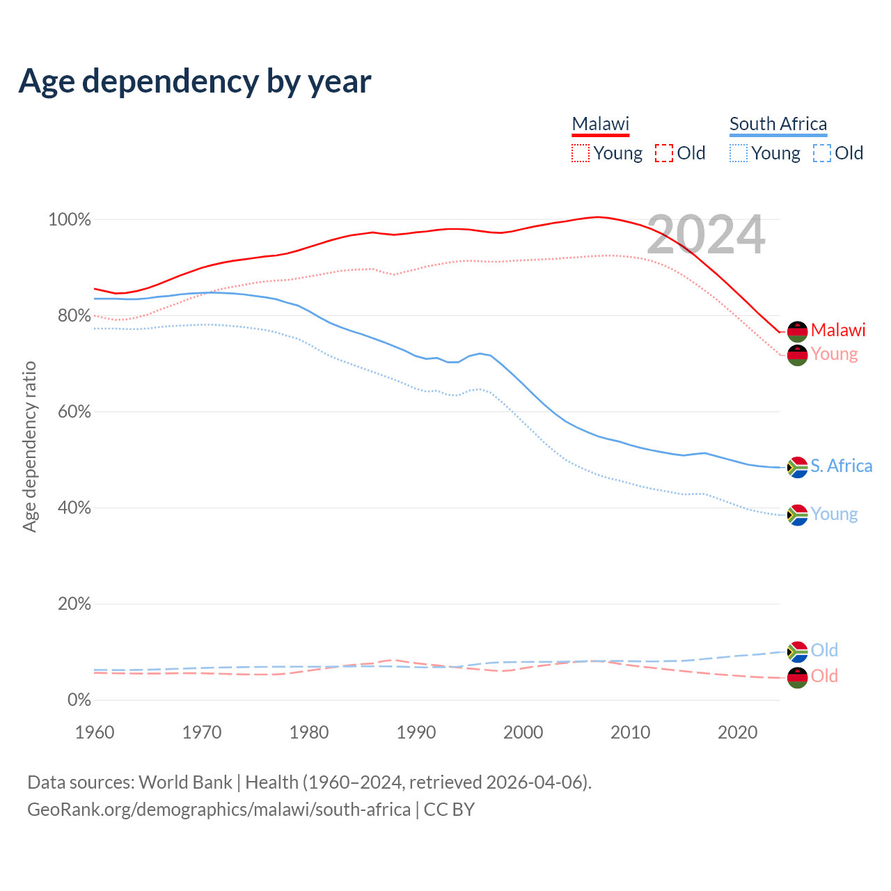 The share of older people aged 65 and over is 2.59% in Malawi and 6.69% in South Africa. Life expectancy in Malawi compared to South Africa .